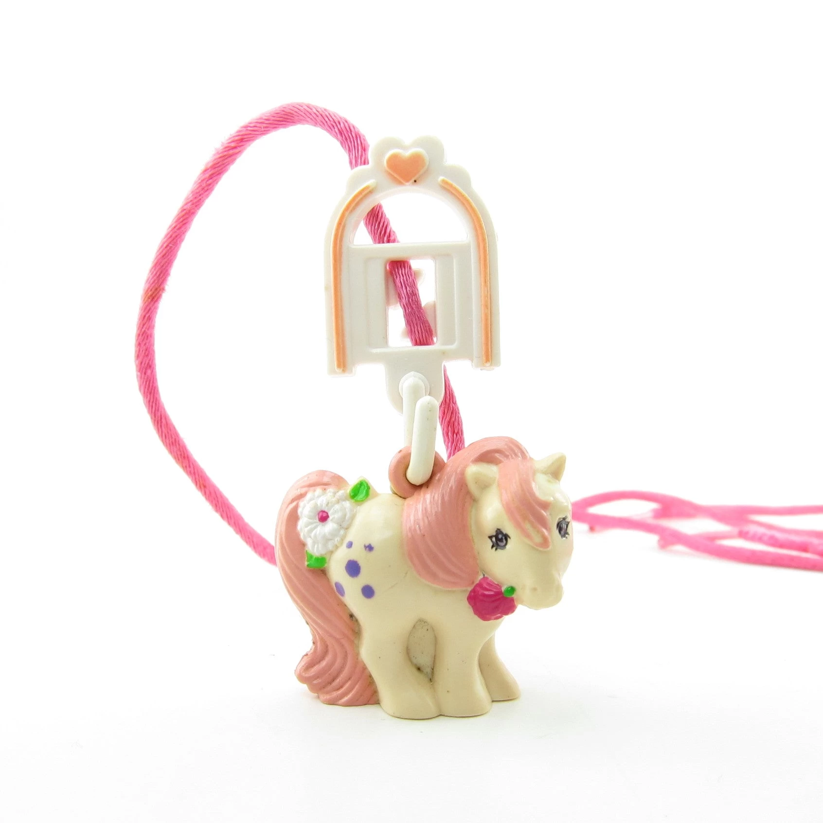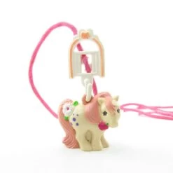 This vintage Charmkins toy is My Pony Pixie, she comes with her original jewelry hanger and pink silk cord necklace. Her appearance is very similar to a My Little Pony since Charmkins and My Little Pony toys were both made by Hasbro. This same mold was later used to make the My Little Pony Mommy or Mummy Charms.