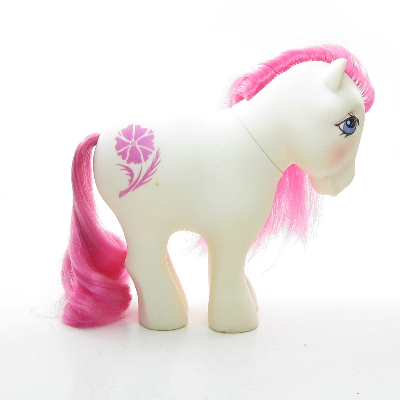 This vintage My Little Pony is Cosmos, she’s the Birthflower Pony for the month of October. She’s a white Earth pony with a bright pink mane and tail and purple eyes. Her symbol is a pink cosmos, October’s birth flower.