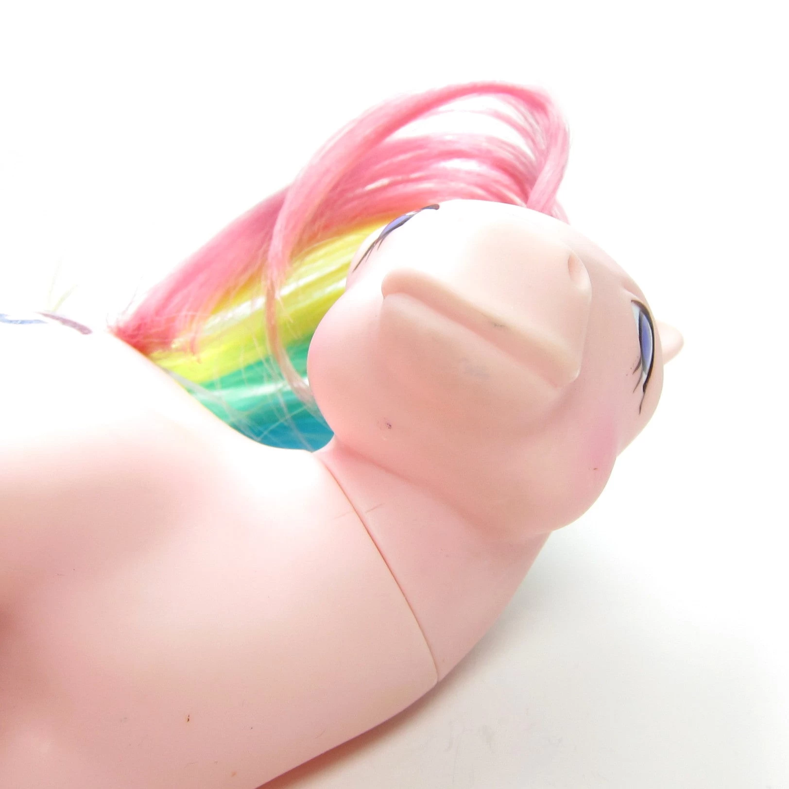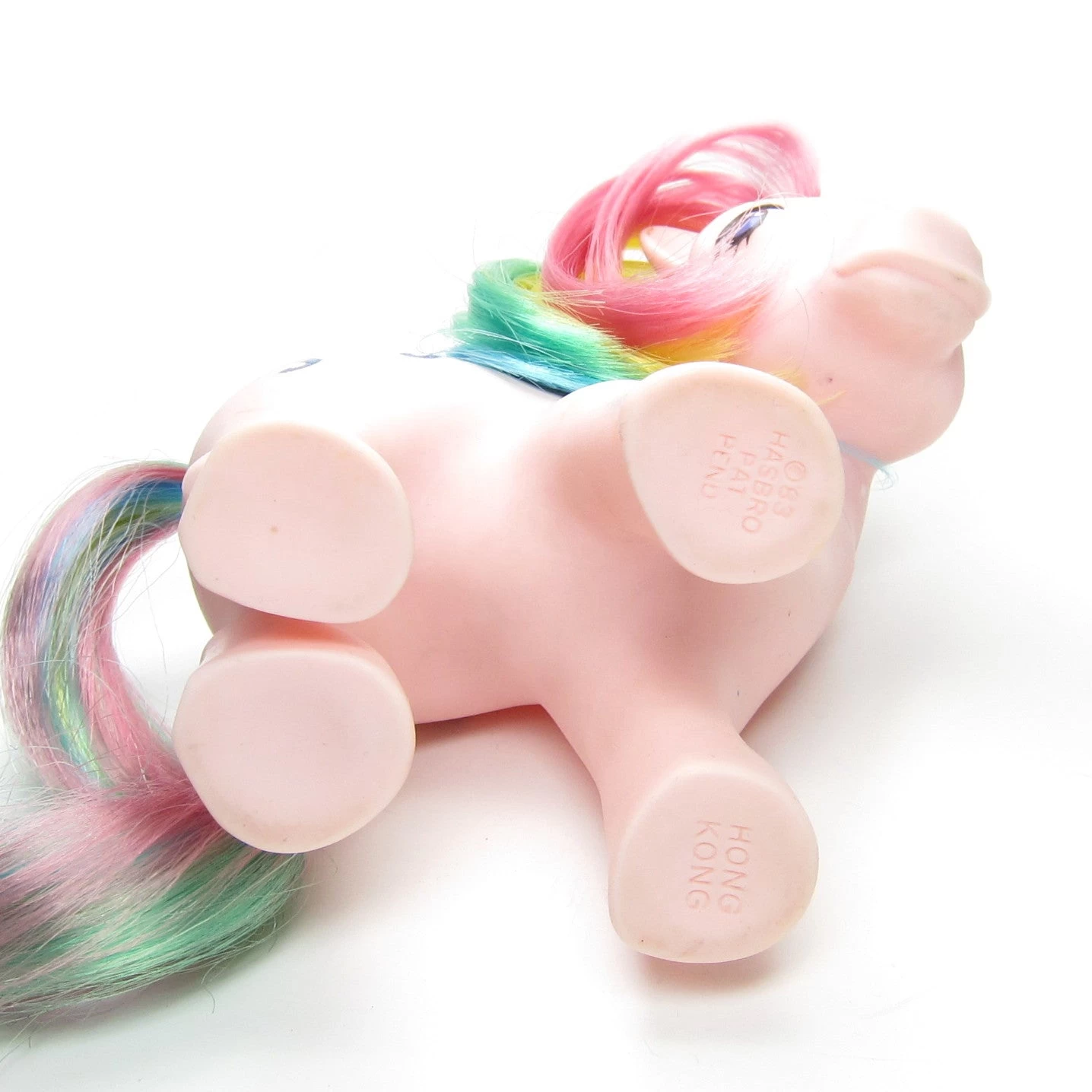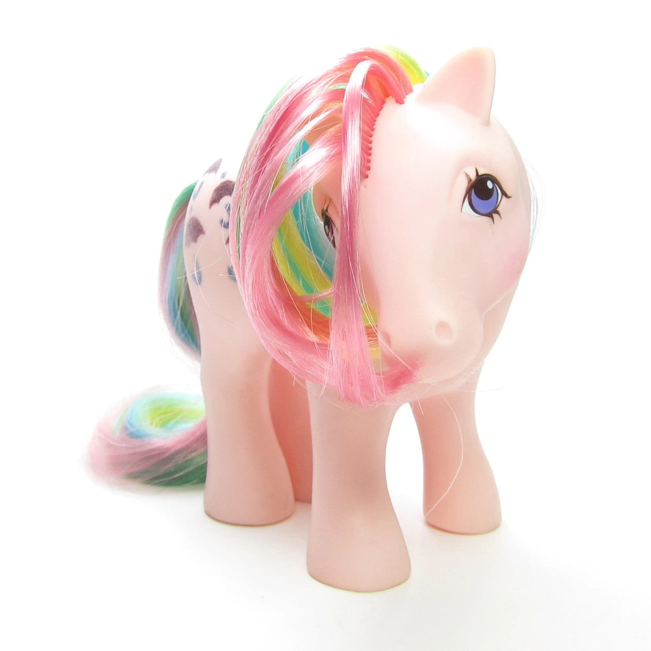 This vintage G1 My Little Pony is Parasol, she’s a pink Rainbow Pony that first appeared in Year 2 of the My Little Pony line. Parasol’s mane and tail both have shades of pink, yellow, green and blue, and her eyes are purple. Her symbol is 4 glittery umbrellas.