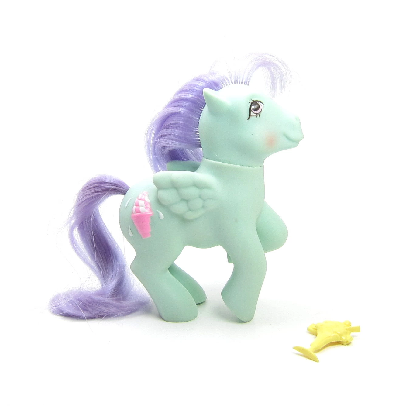 This vintage G1 My Little Pony is Peppermint Crunch, she’s a Sundae Best Pony from Year 6. Peppermint Crunch is an aqua blue pegasus with a purple mane and tail. Her symbol is a pink and white 3D ice cream sundae, and she comes with her original yellow ice cream soda barrette.