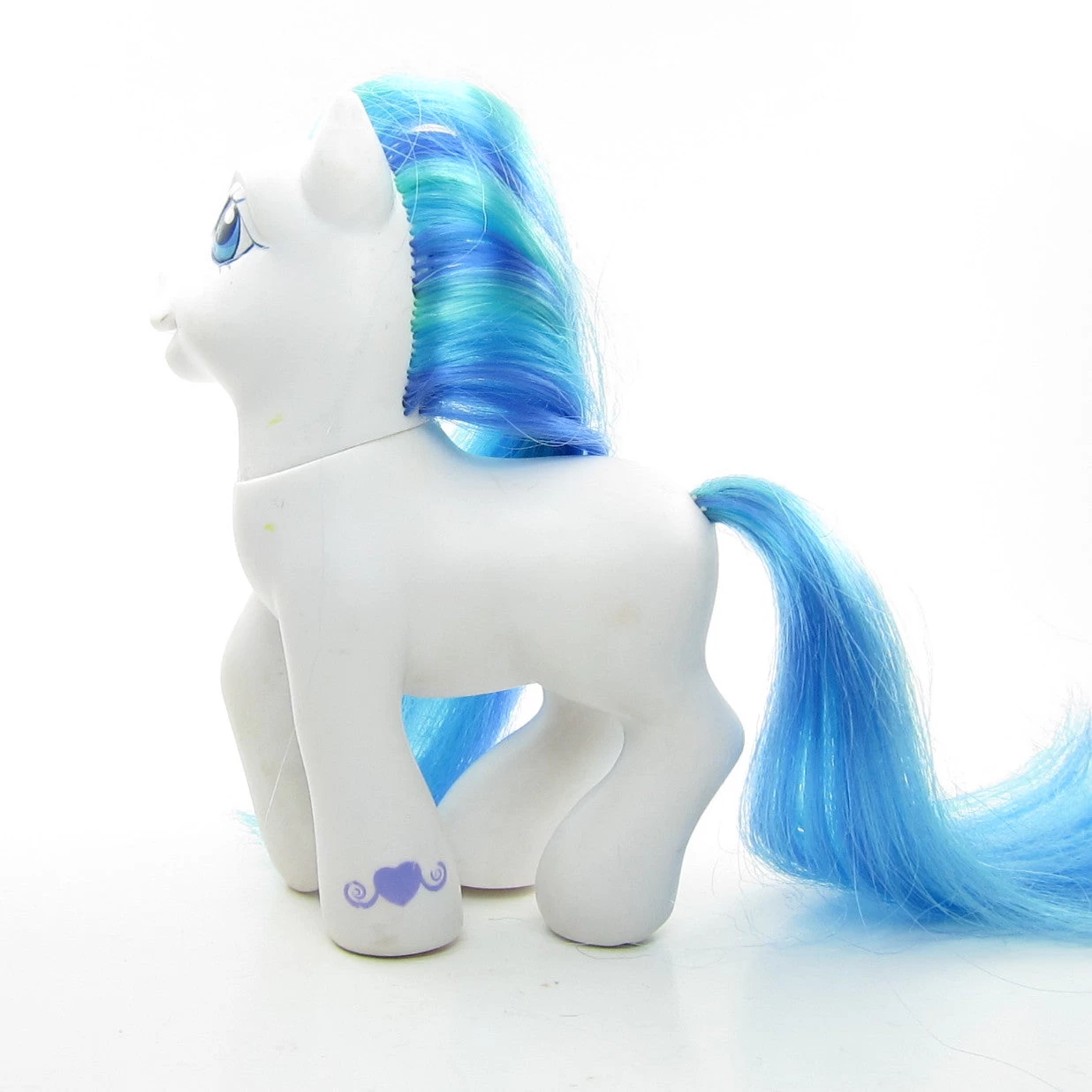 This My Little Pony is Peri Winkle, she’s one of the Jewel Ponies from Year 2 of the G3 line. Peri Winkle has a white body and her hair has blue and teal stripes. Her eyes are blue with a blue star and her symbol has blue and purple swirls with a blue rhinestone jewel in the center. She has a purple hoof heart with swirls on her front left hoof and a magnet on the bottom of that hoof.