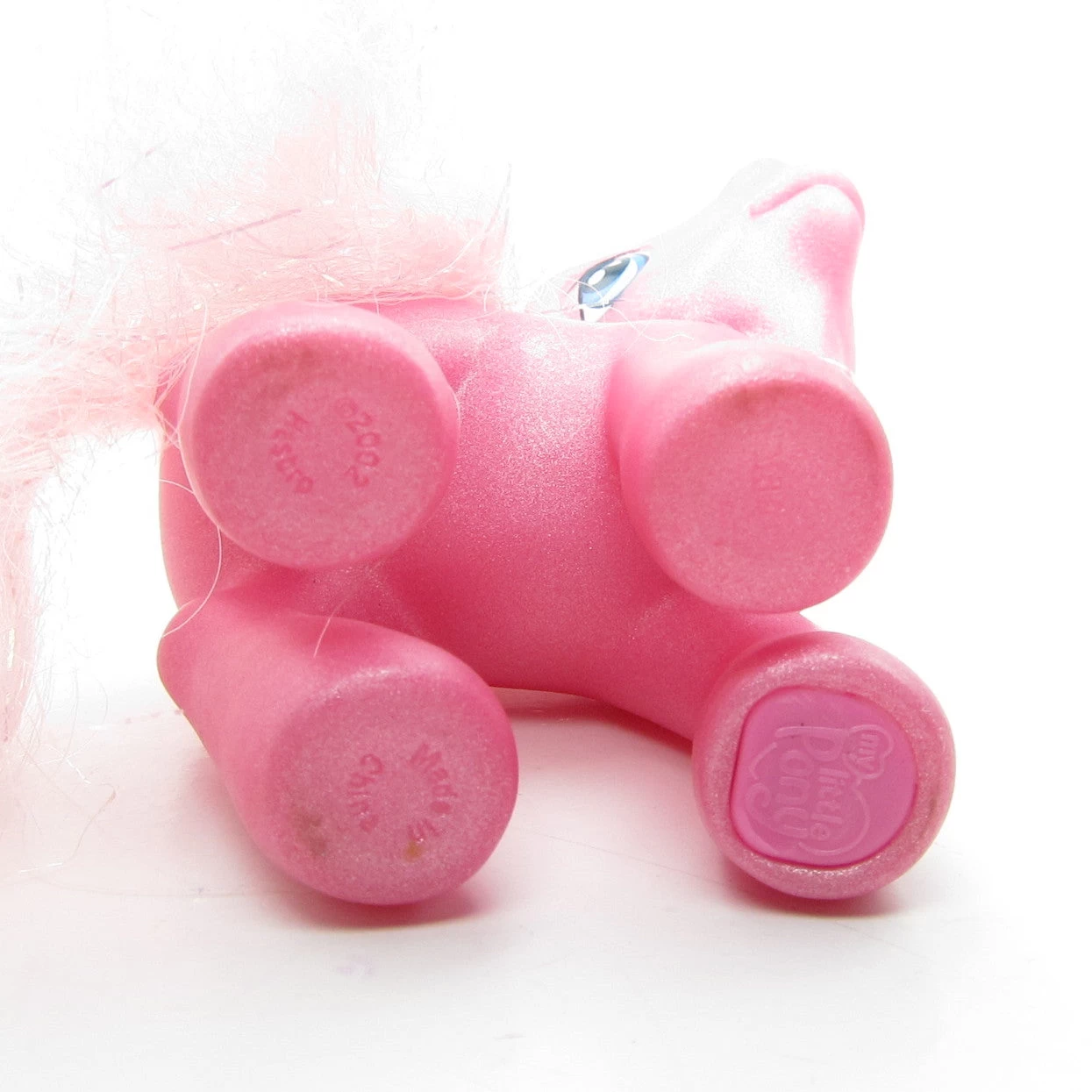 Pinkie Pie II has a pearlescent pink body and pale pink hair with iridescent tinsel. Her eyes are blue with a pink heart and her cutie mark is three blue and yellow balloons. She has a blue hoof heart on her front left hoof and a magnet on the bottom of that hoof.