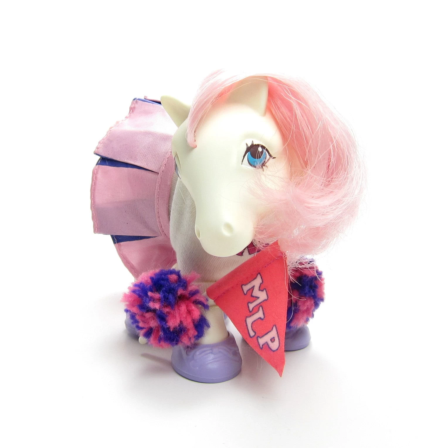 This vintage G1 My Little Pony outfit is the Pom Pom Pony Wear set, it includes a white t-shirt that says “MLP,” a pink and purple cheerleading skirt, 2 pink and purple pom poms, light purple shoes, and a pink “MLP” pennant.Â