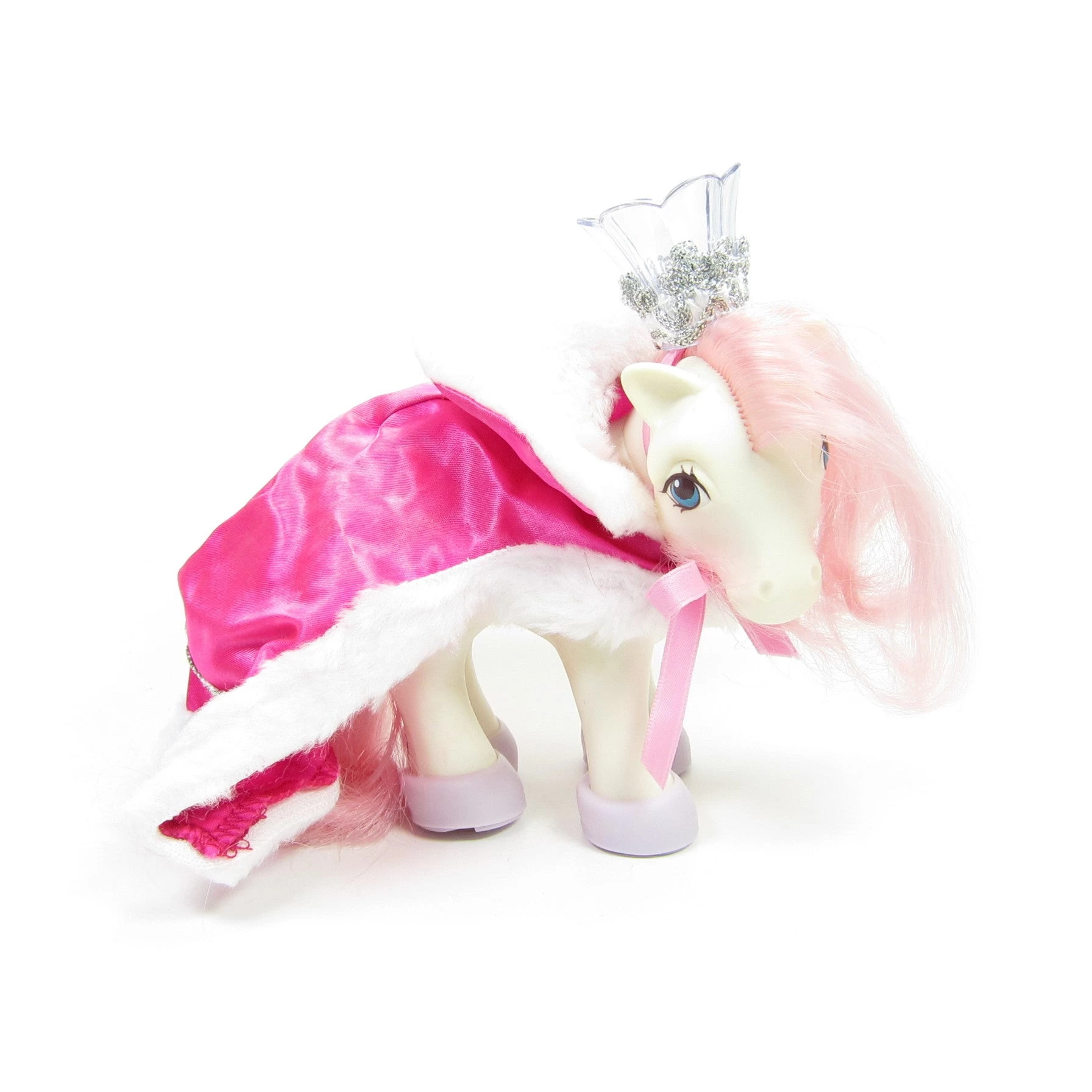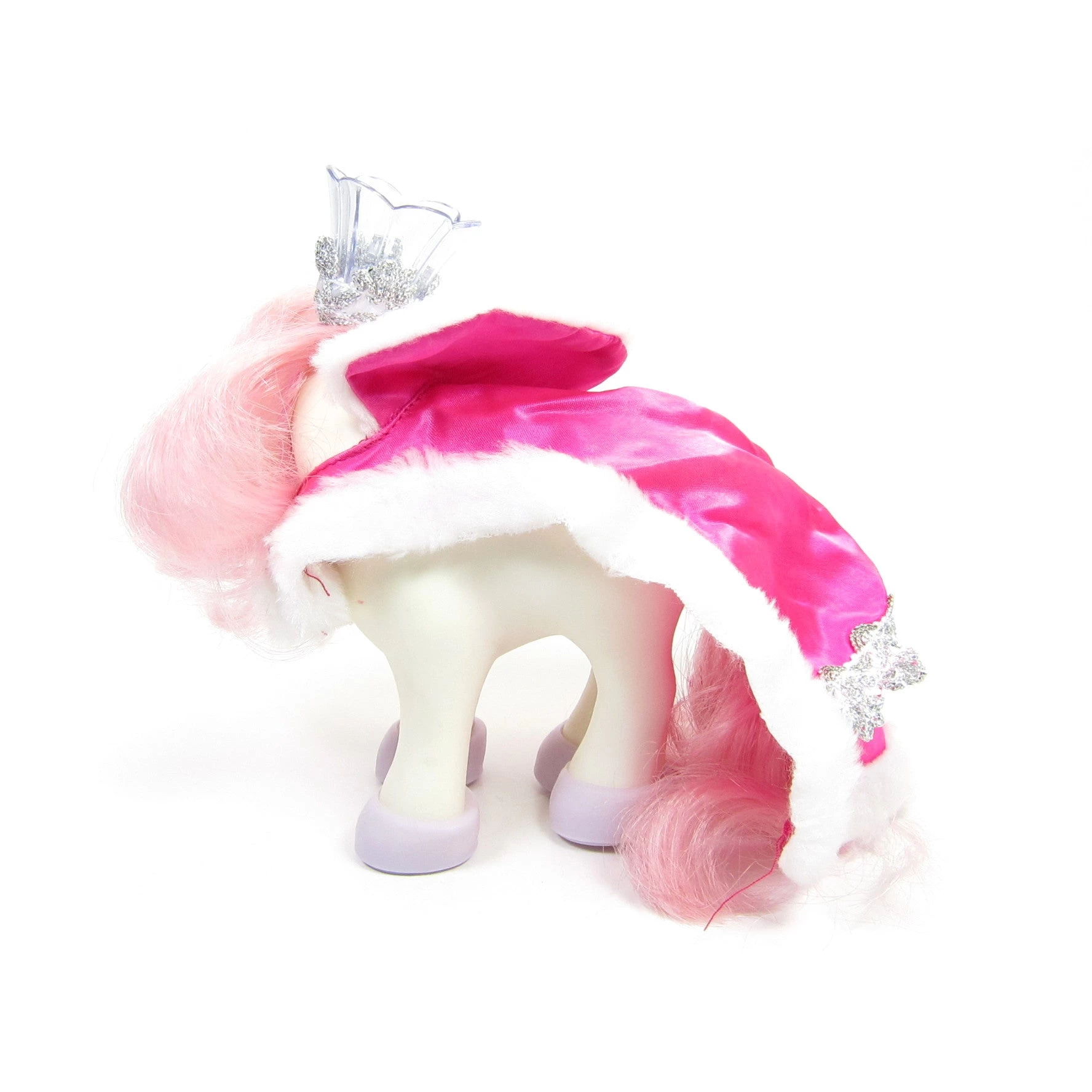 This vintage G1 My Little Pony outfit is the Pony Royal Pony Wear set. It includes a silky magenta cape with white faux-fur trim, a set of four pale lavender shoes, and a clear plastic crown. The cape fastens around the pony’s neck with velcro, and the crown can be tied on the head with a ribbon.