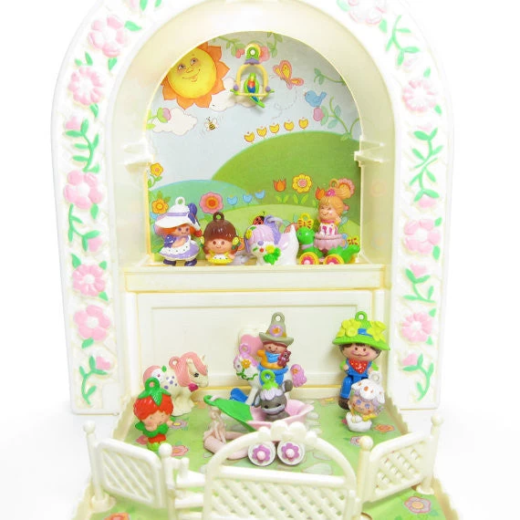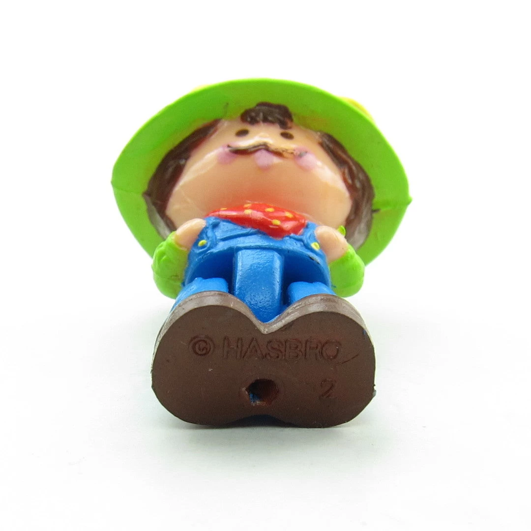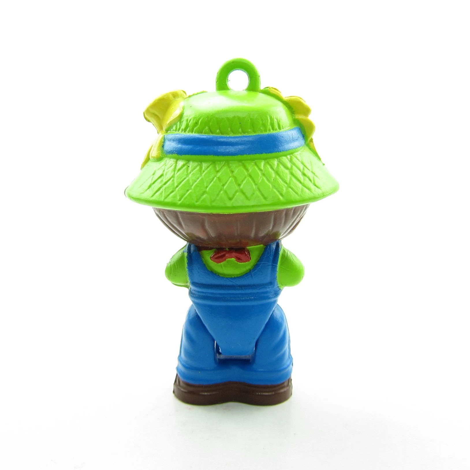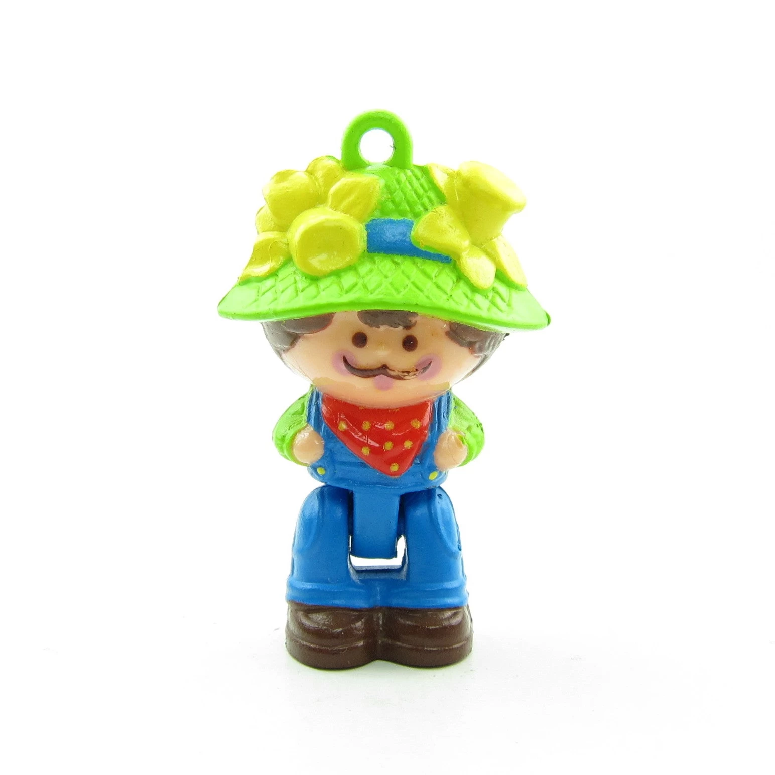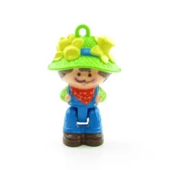 This vintage Charmkins figure is Pop-Corn, he’s a farmer wearing blue overalls, a red polka dot bandana, and a green hat with daffodils on it. He has brown hair and a mustache and his legs are poseable so he can sit. He is missing his zipper pull hanger.