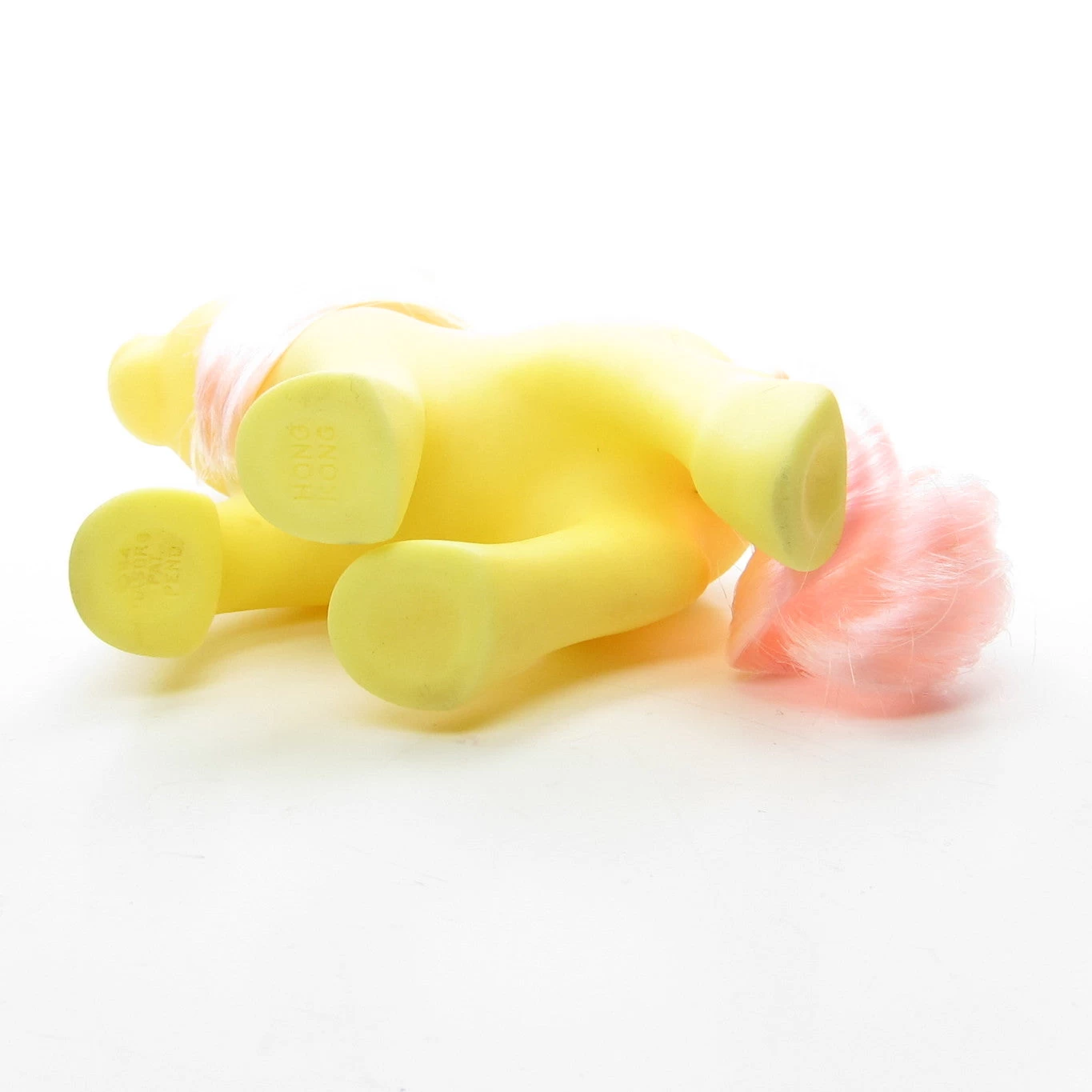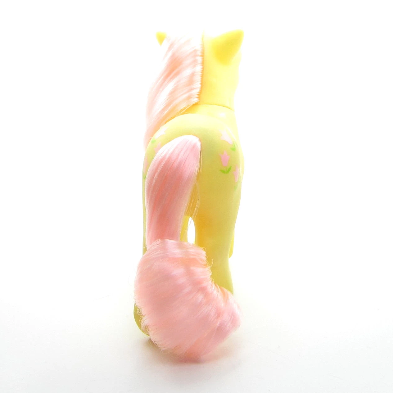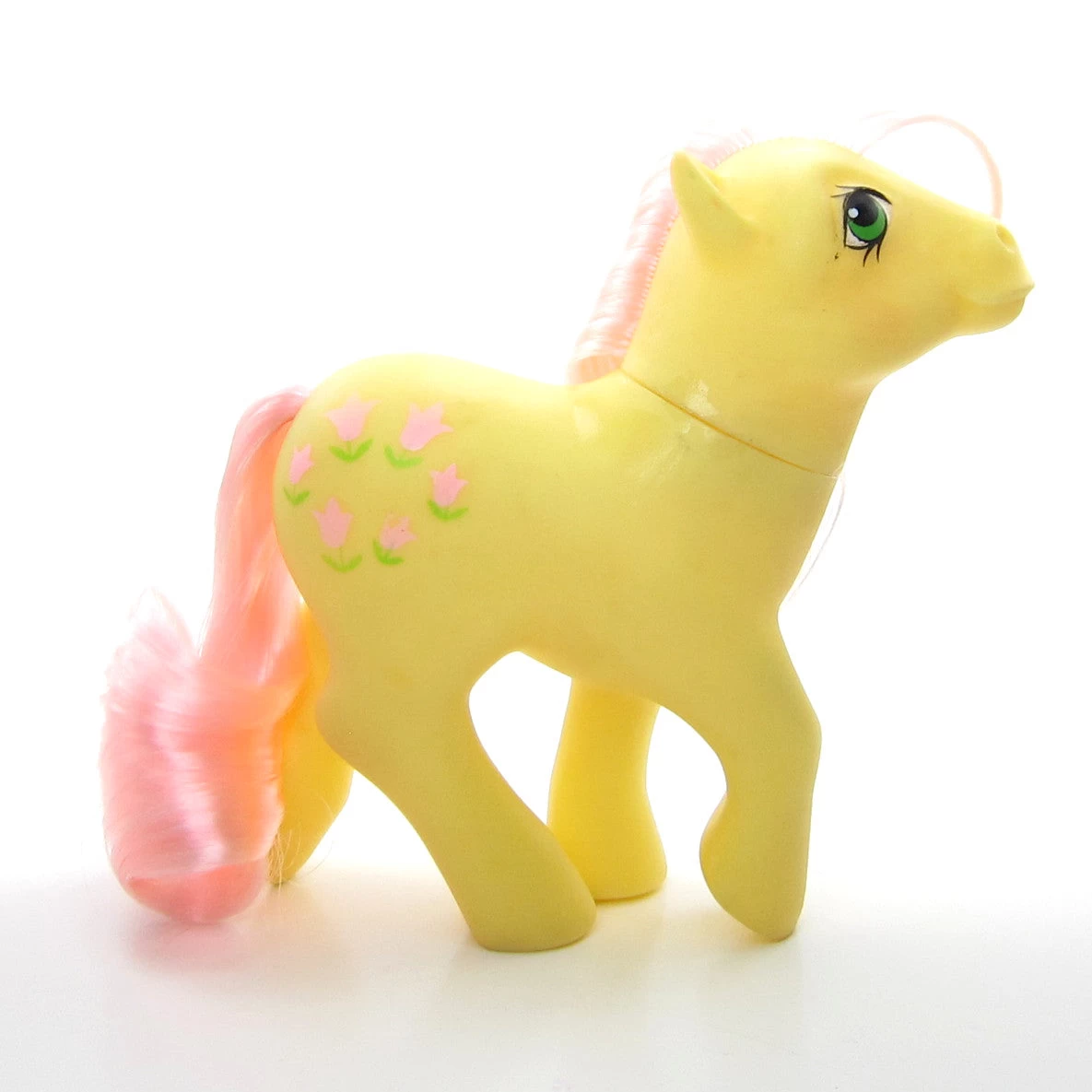 This vintage G1 My Little Pony is Posey, she’s a yellow Earth pony that was released in Year 3 of the My Little Pony line. Her hair is pale pink, her eyes are green, and her symbol is six pink tulips with green leaves and stems.Â