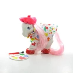 This vintage G1 My Little Pony outfit is the Pretty As A Picture Pony Wear set. It includes a white paint smock with colorful paint splatter, a soft red beret, red shoes, a paint palette, and a paintbrush. The set originally came with blue pants, but those are missing.