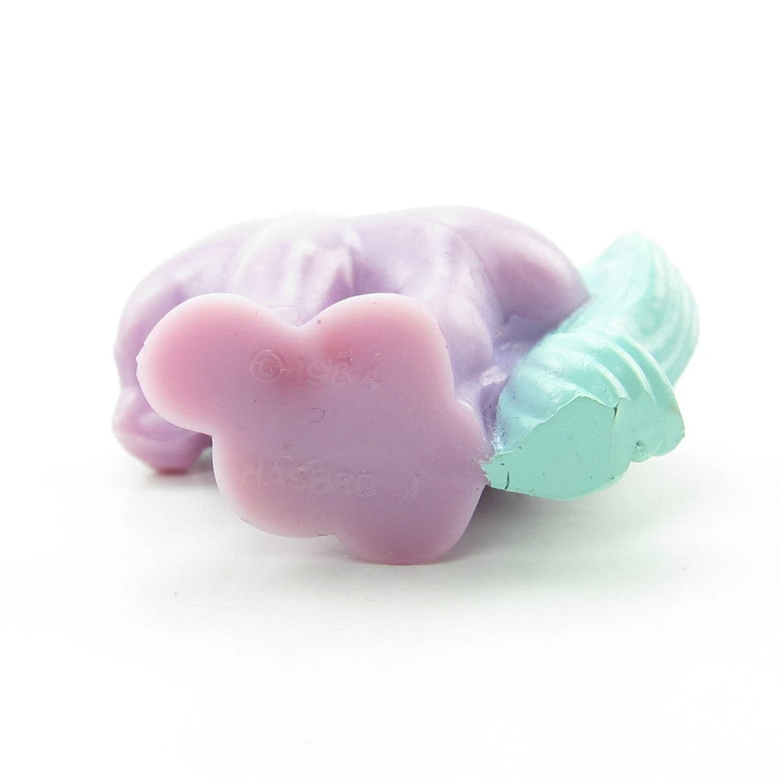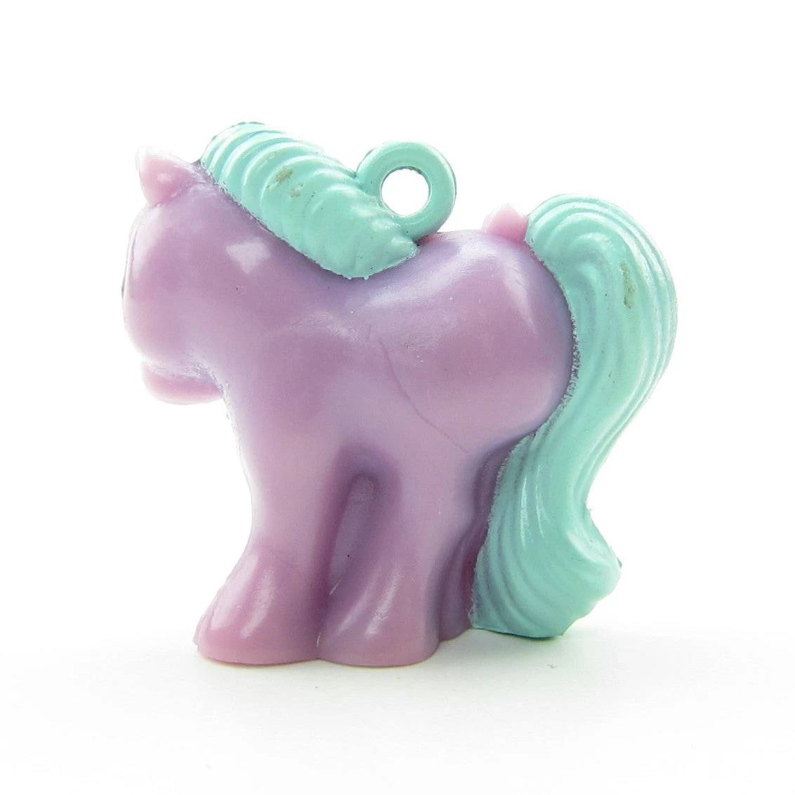 This vintage G1 My Little Pony mommy or mummy charm is Pretty Please. She’s purple with aqua blue hair and a white sugar bowl for her symbol.