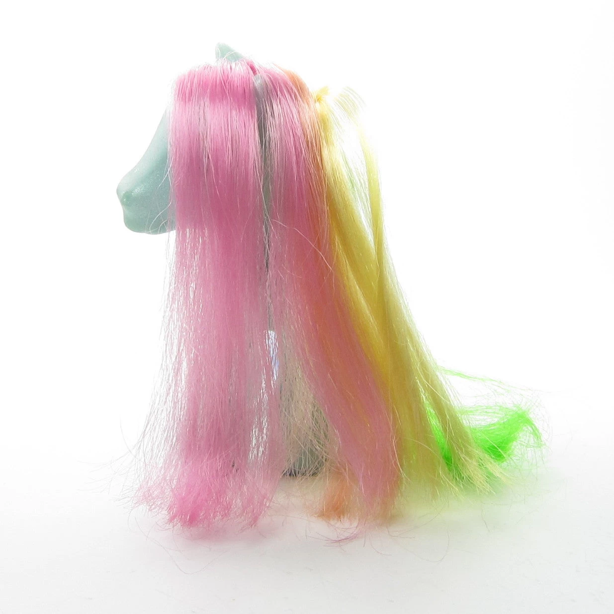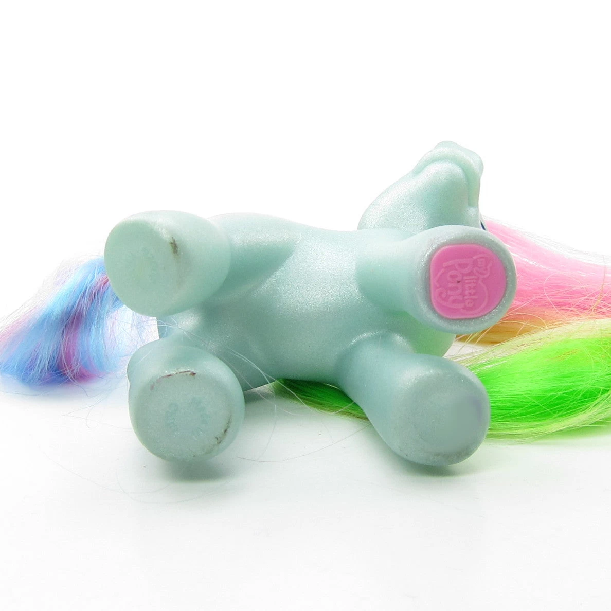 This My Little Pony is Rainbow Dash II, she’s from the second set of Rainbow Celebration Ponies from Year 1 of the G3 line. She has a pearlescent blue body, rainbow-colored eyes with a green heart, rainbow hair, and a rainbow with clouds for her symbol. She has a purple hoof heart on her front right leg and a magnet on the bottom of that hoof.