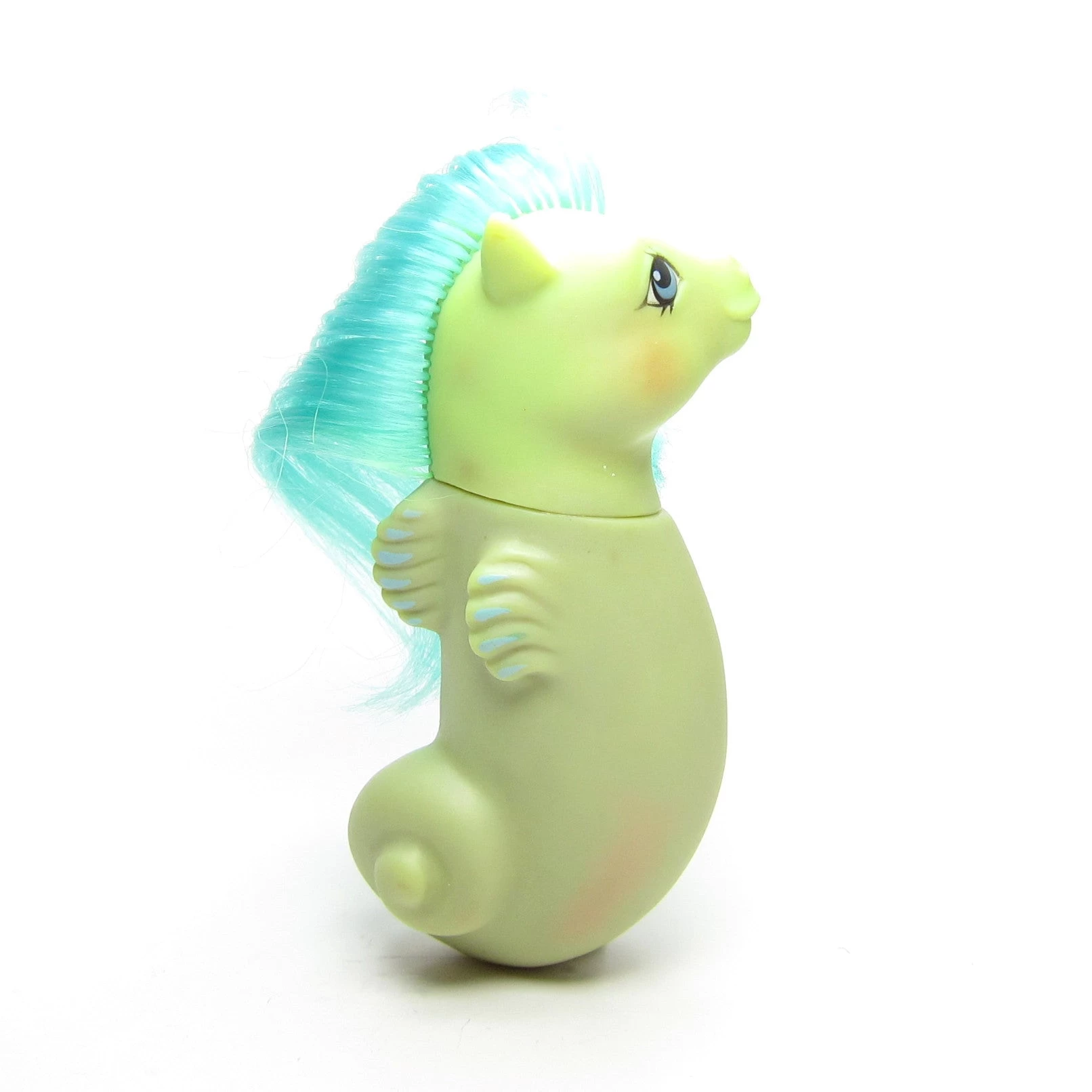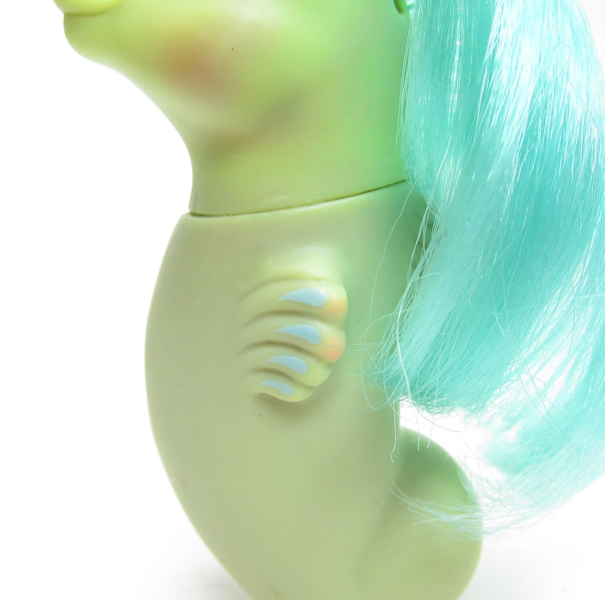 This vintage baby Sea Pony is Sea Shimmer, she’s a G1 My Little Pony from Year 3. She has a green body with aqua blue hair and eyes.