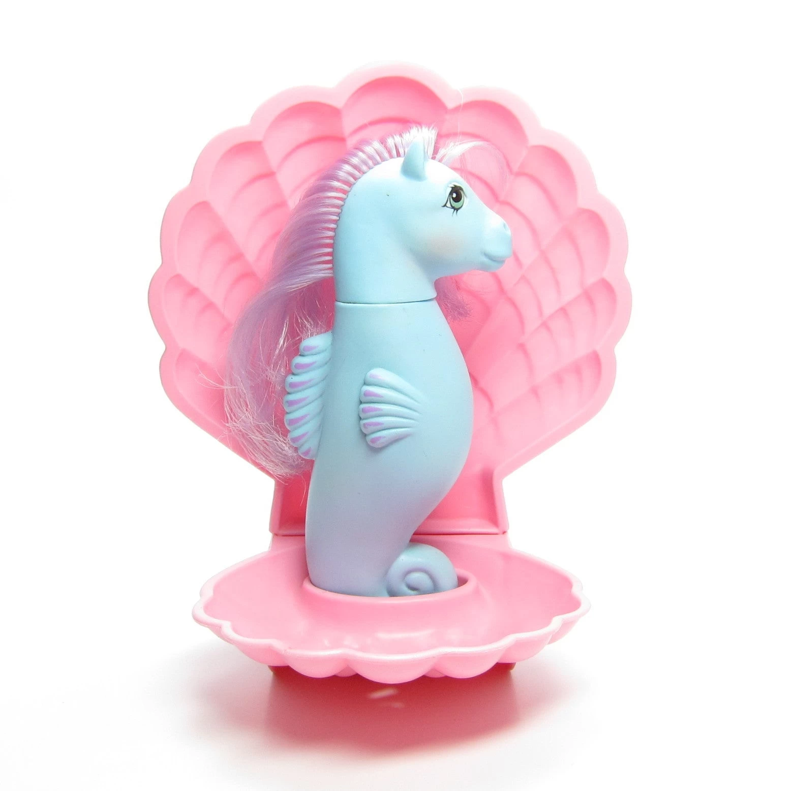 This vintage G1 My Little Pony Sea Pony is Seawinkle, she’s blue with a purple mane and has blue eyes. She comes with her original pink clamshell stand.