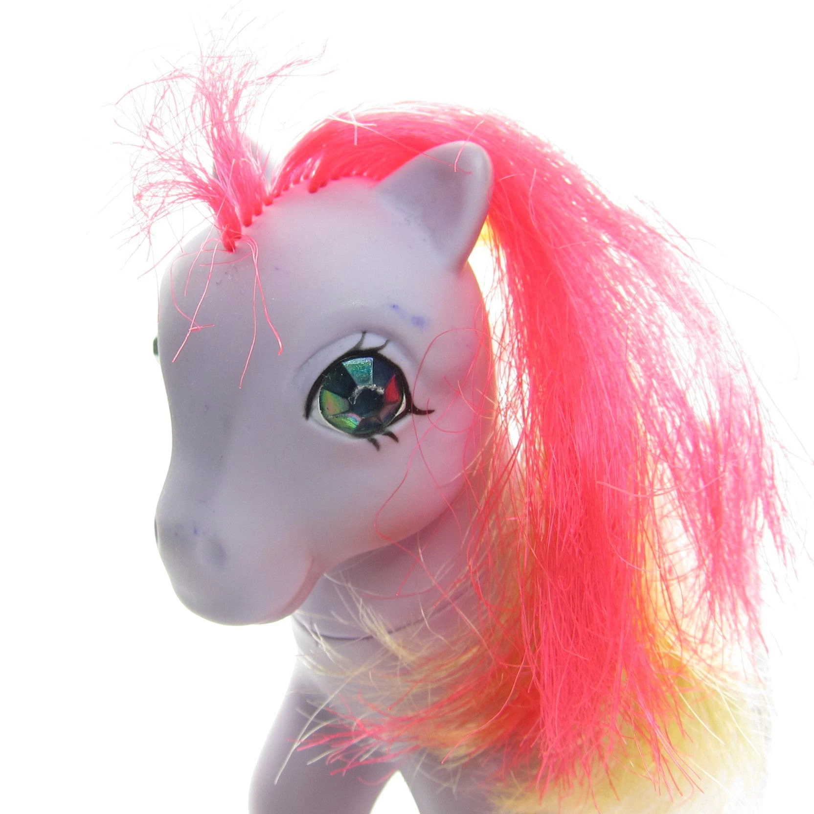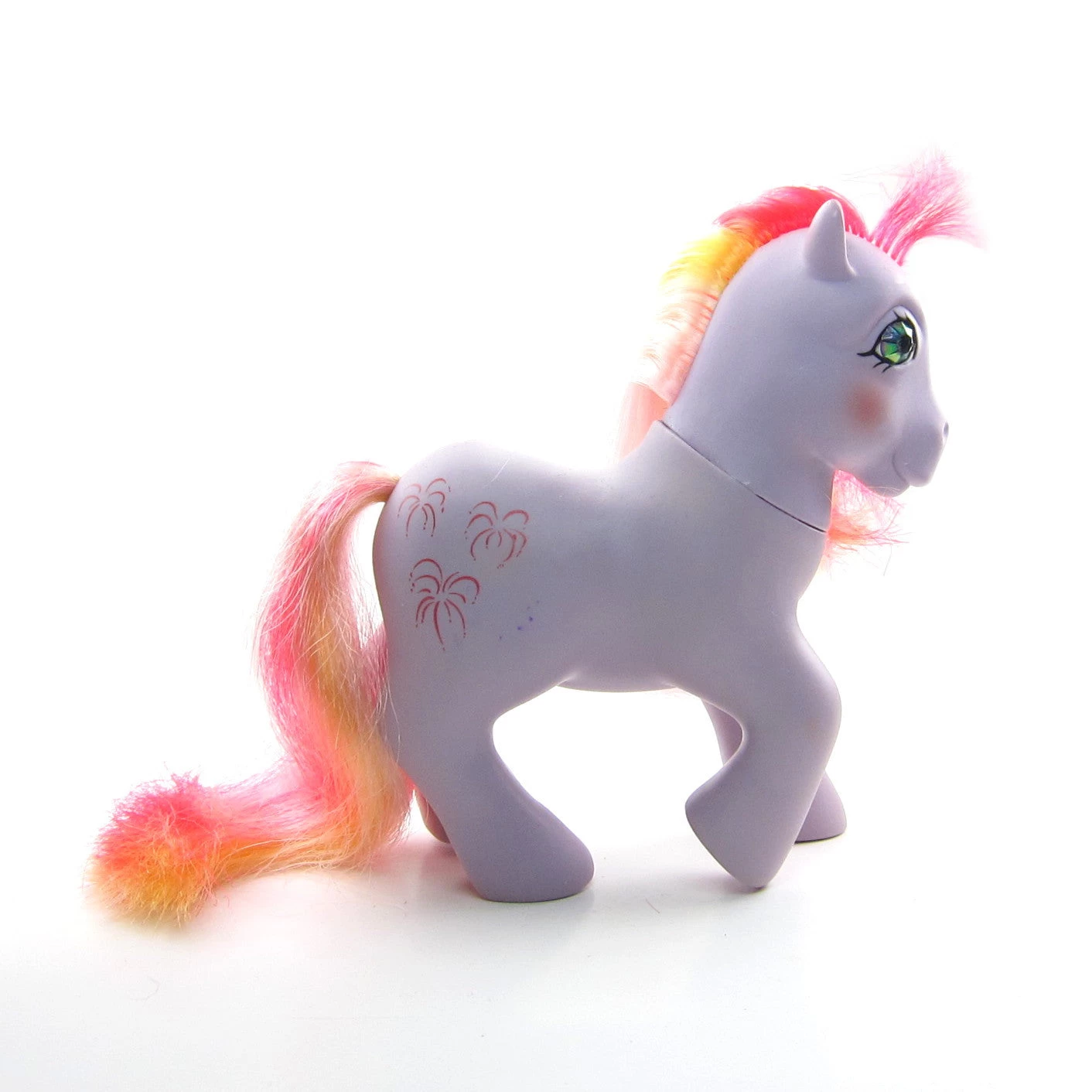 This vintage G1 My Little Pony is Sky Rocket, she’s one of the Twinkle Eyed Ponies from Year 4. She’s a purple Earth pony and has a colorful mane and tail with stripes of red, yellow, white, and light pink. Her symbol is three red fireworks.