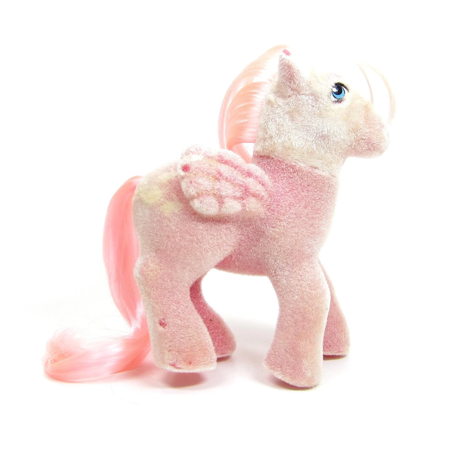 This vintage G1 My Little Pony is Hippity Hop, she’s one of the So Soft Ponies from Year 4 and has flocking all over her body. Hippity Hop is a pegasus with light pink hair and 3 white bunny rabbits for her symbol. Her flocking is a very pale pink, almost off-white color.