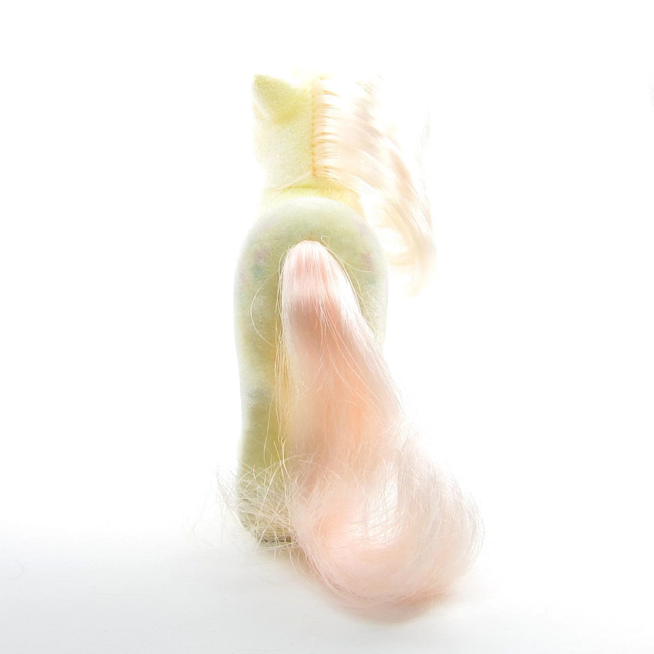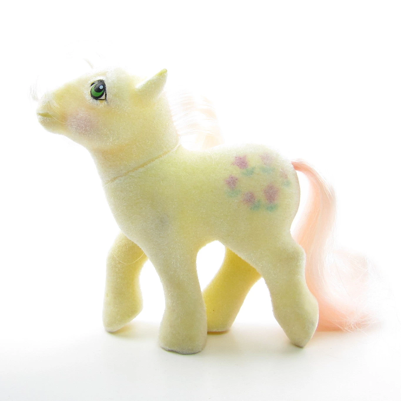 This vintage G1 My Little Pony is Posey, she’s one of the So Soft Ponies from Year 4 and has pale yellow flocking all over her body.Â