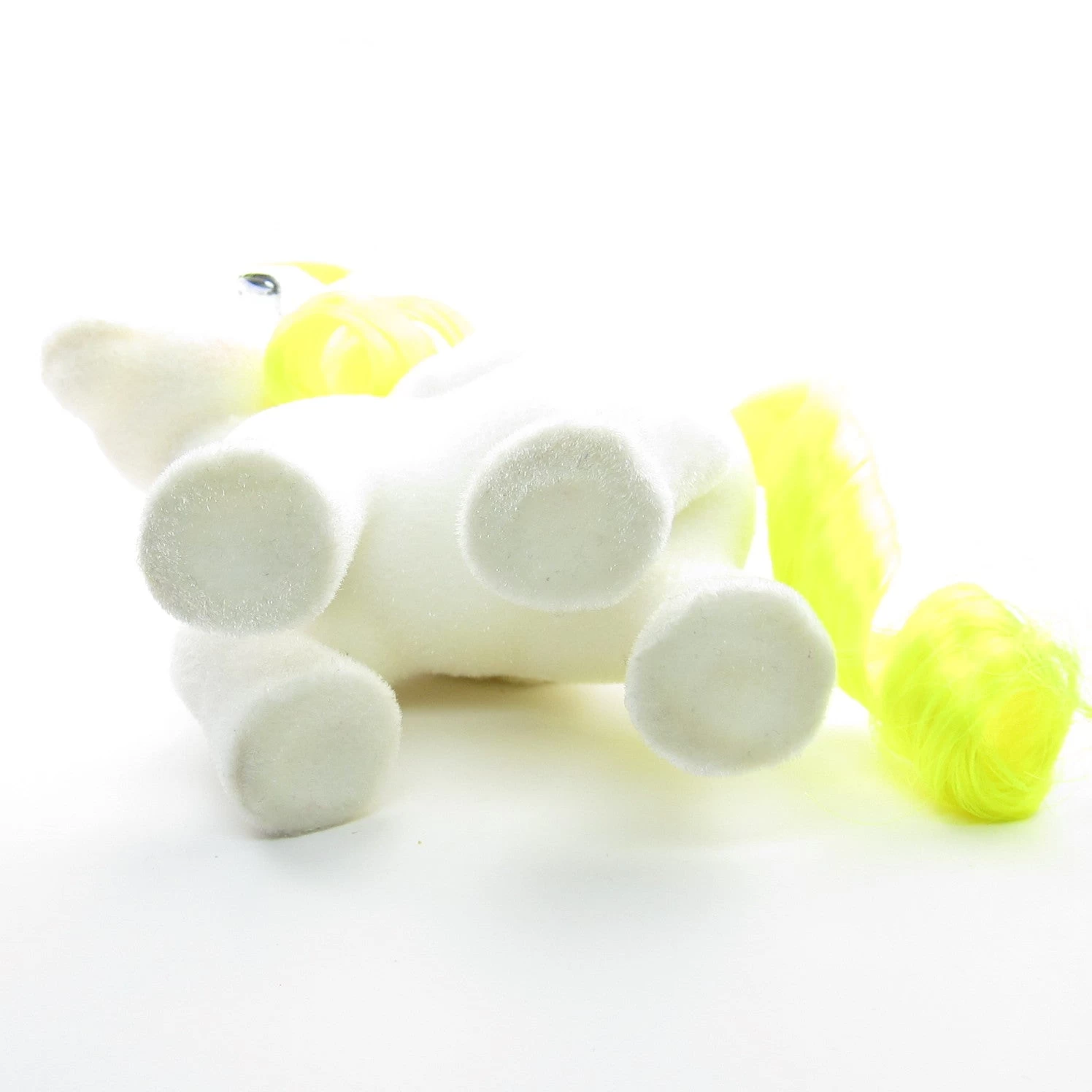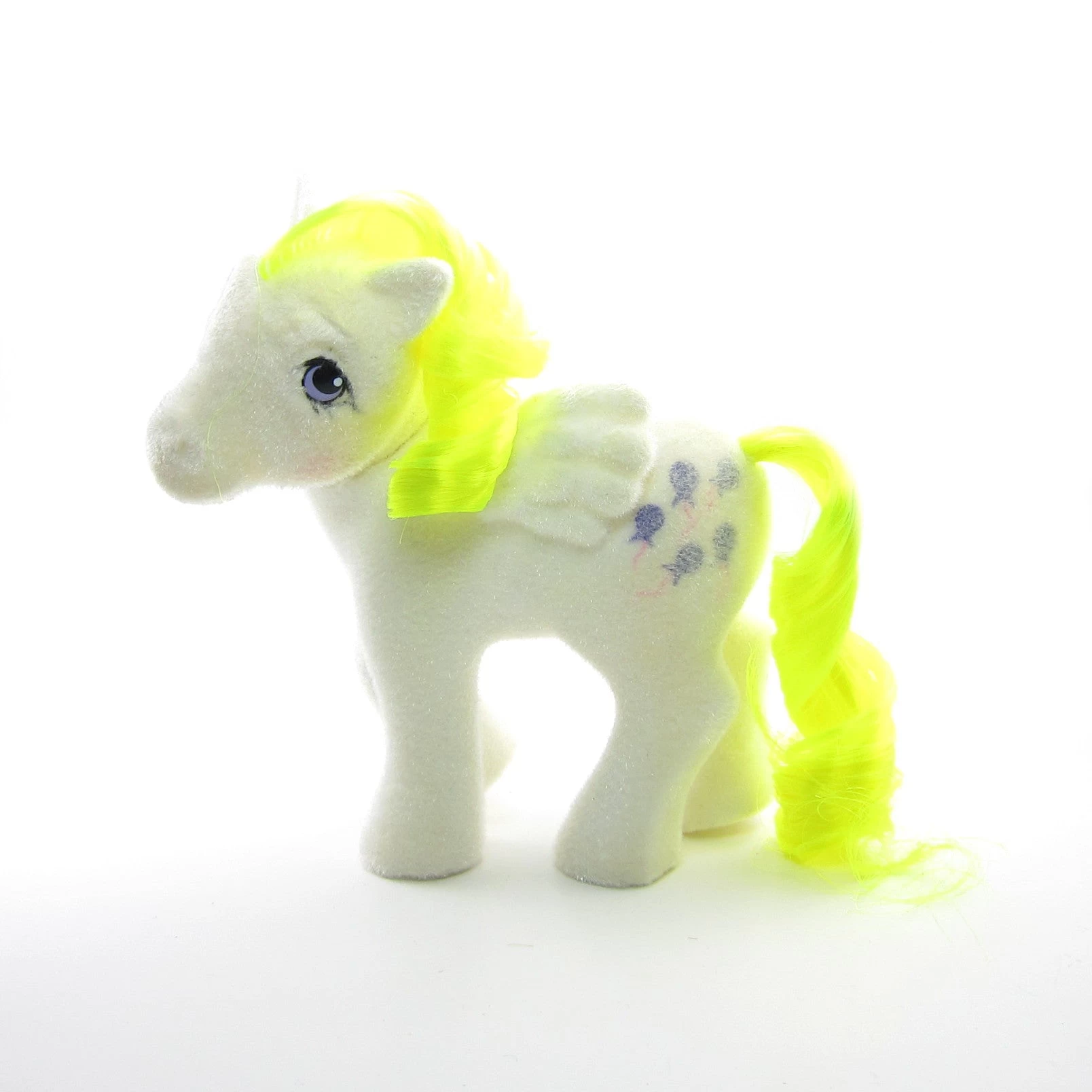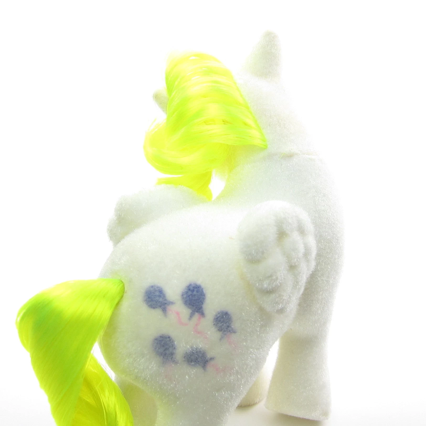 This vintage G1 My Little Pony is Surprise, she’s one of the So Soft Ponies from Year 4 and is white with white flocking all over her body. Surprise is a pegasus with neon yellow hair and 5 purple balloons with pink strings for her symbol.Â