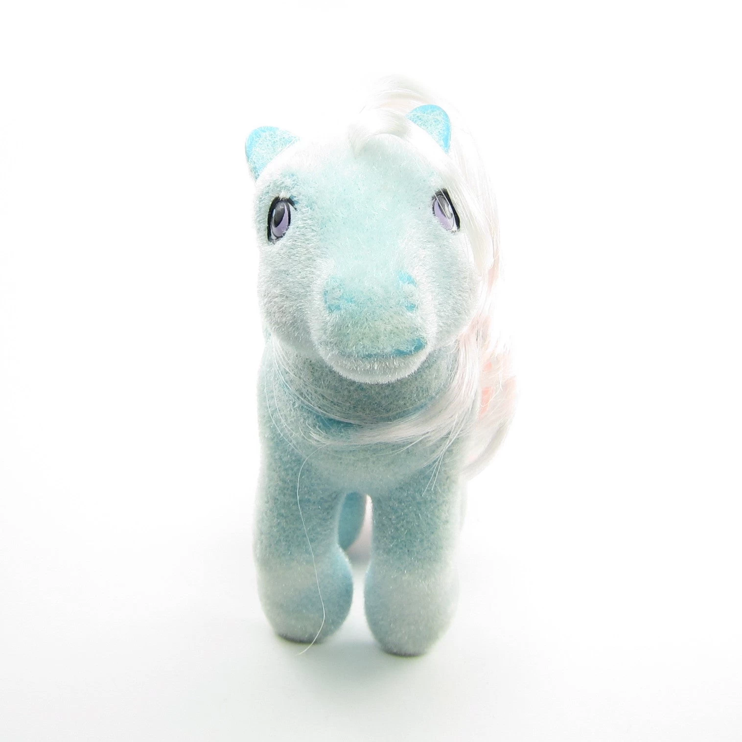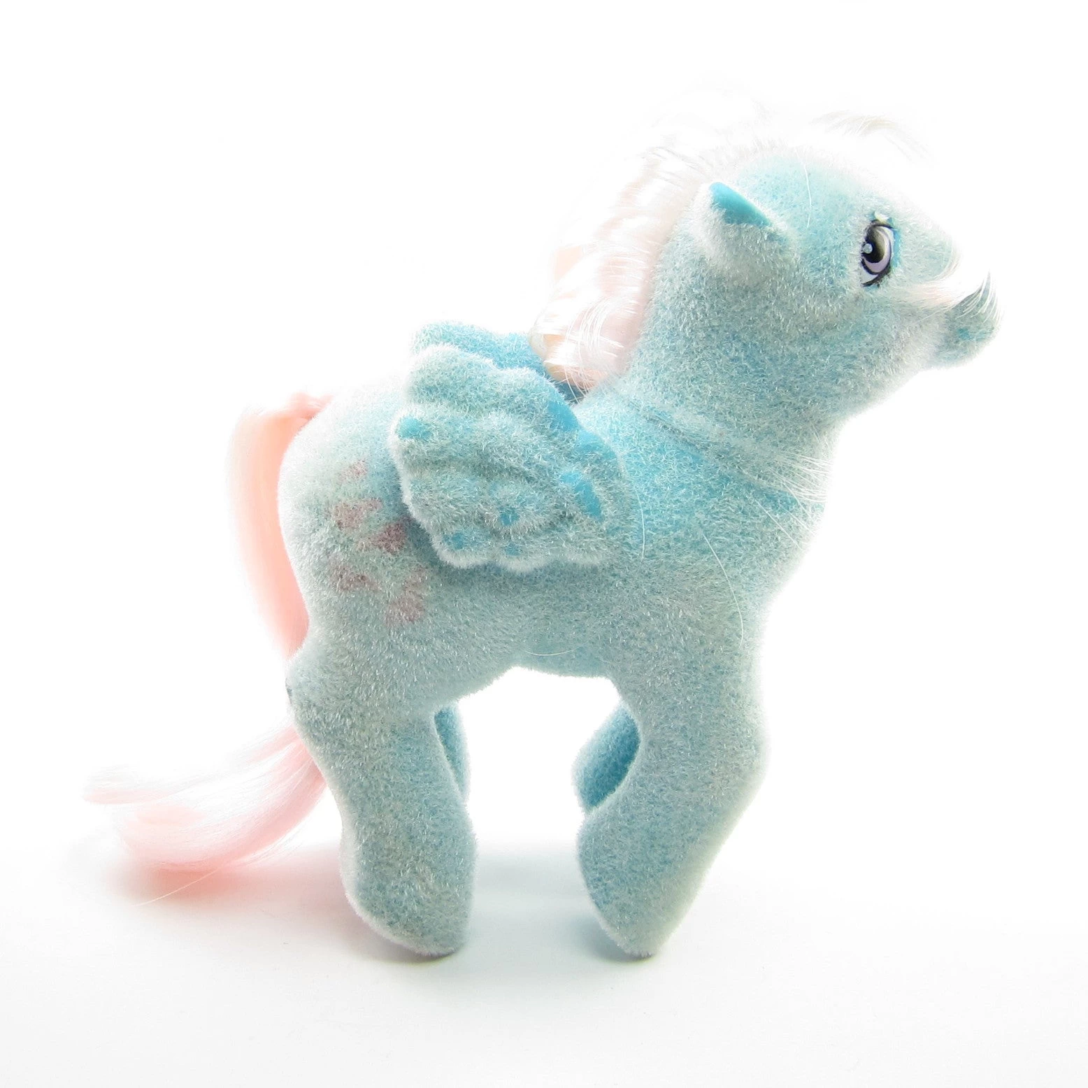This vintage G1 My Little Pony is Wind Whistler, she’s one of the So Soft Ponies from Year 4 and has flocking all over her body. Wind Whistler is an aqua blue pegasus with light pink hair, purple eyes, and 5 dark pink whistles for her symbol.Â