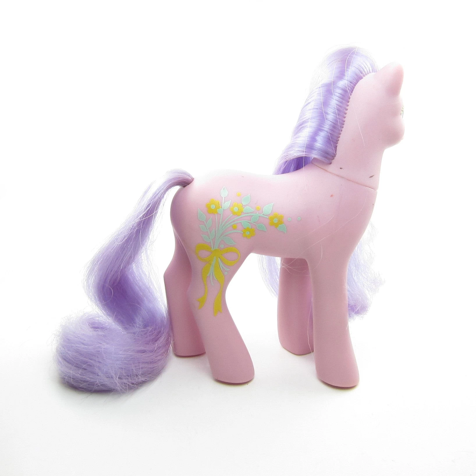 This vintage G1 My Little Pony is Spring Song, she’s one of the Sweetheart Sister ponies from Year 7. Spring Song has a purple body, blue eyes, and purple hair. Her symbol is a bouquet of yellow flowers with green stems tied with a yellow bow.