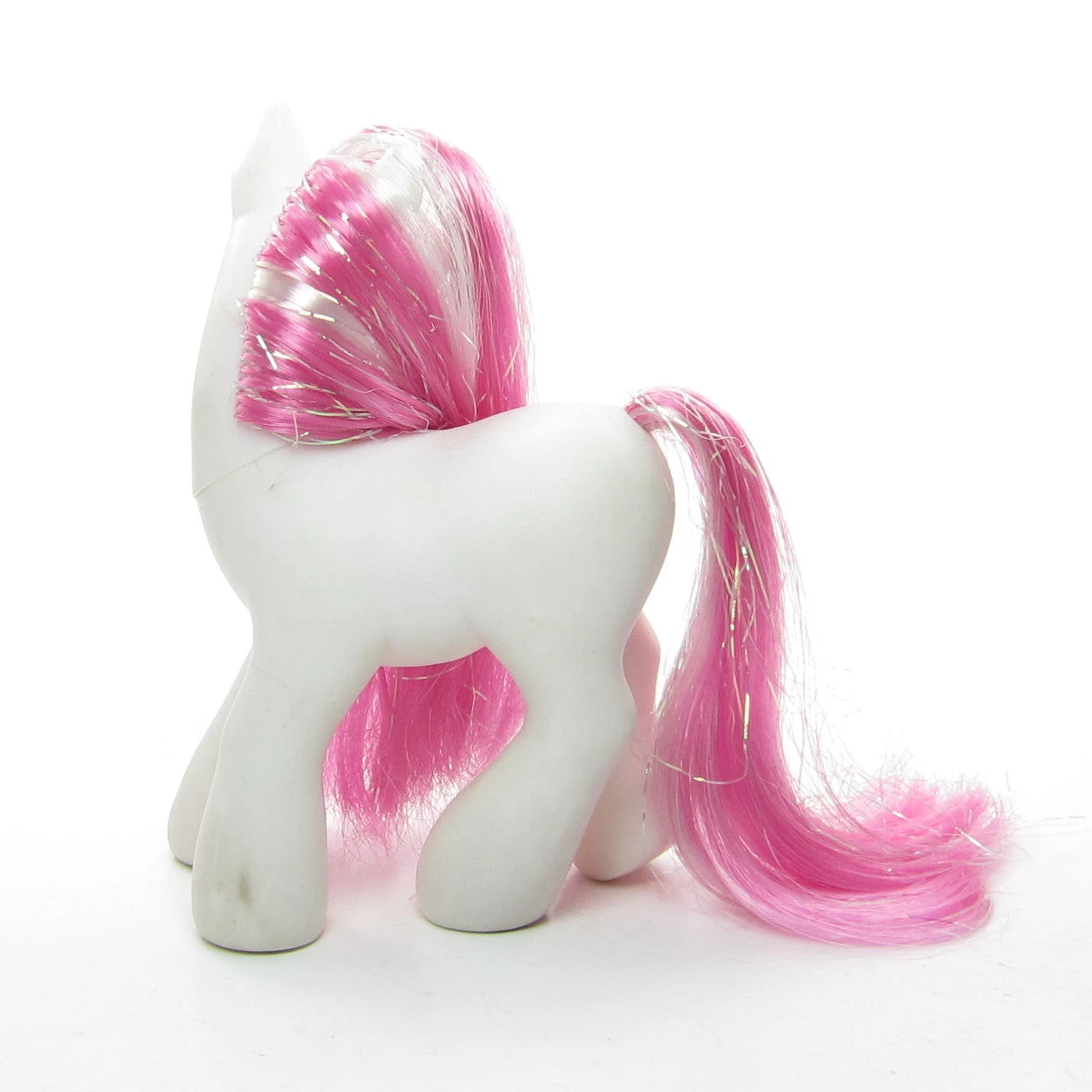This My Little Pony is Star Swirl from Year 1 of the G3 line. She was originally sold in a promotion pack along with Sparkleworks or Minty. Star Swirl has a white body and pink hair with iridescent tinsel. Her eyes are blue with a purple star and her cutie mark is a swirl with red and silver stars. She has a dark pink hoof heart on her front right hoof and a magnet on the bottom of that hoof.