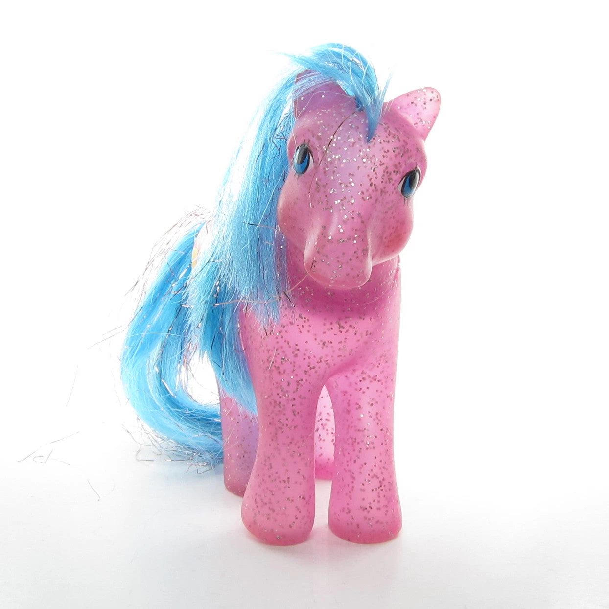 This vintage G1 My Little Pony is Stardancer, she’s a Sparkle Pony from Year 7. Stardancer is an earth pony and her body is made of translucent pink plastic with silver glitter in it. She has turquoise hair with strands of pink tinsel mixed in. Her symbol is a two stars (one white, one yellow) with their arms around each other.