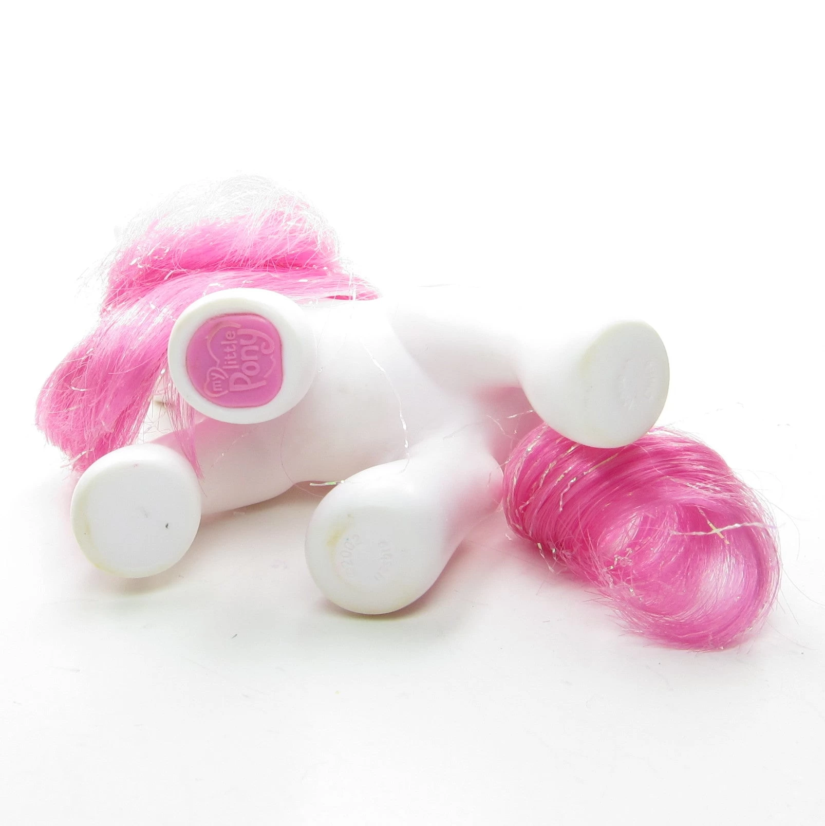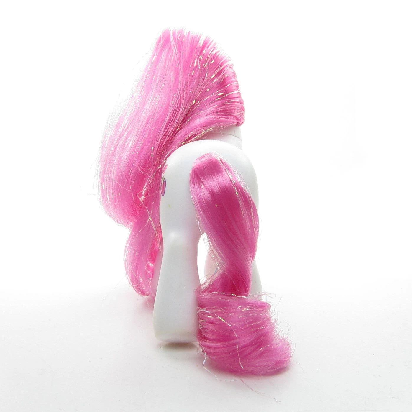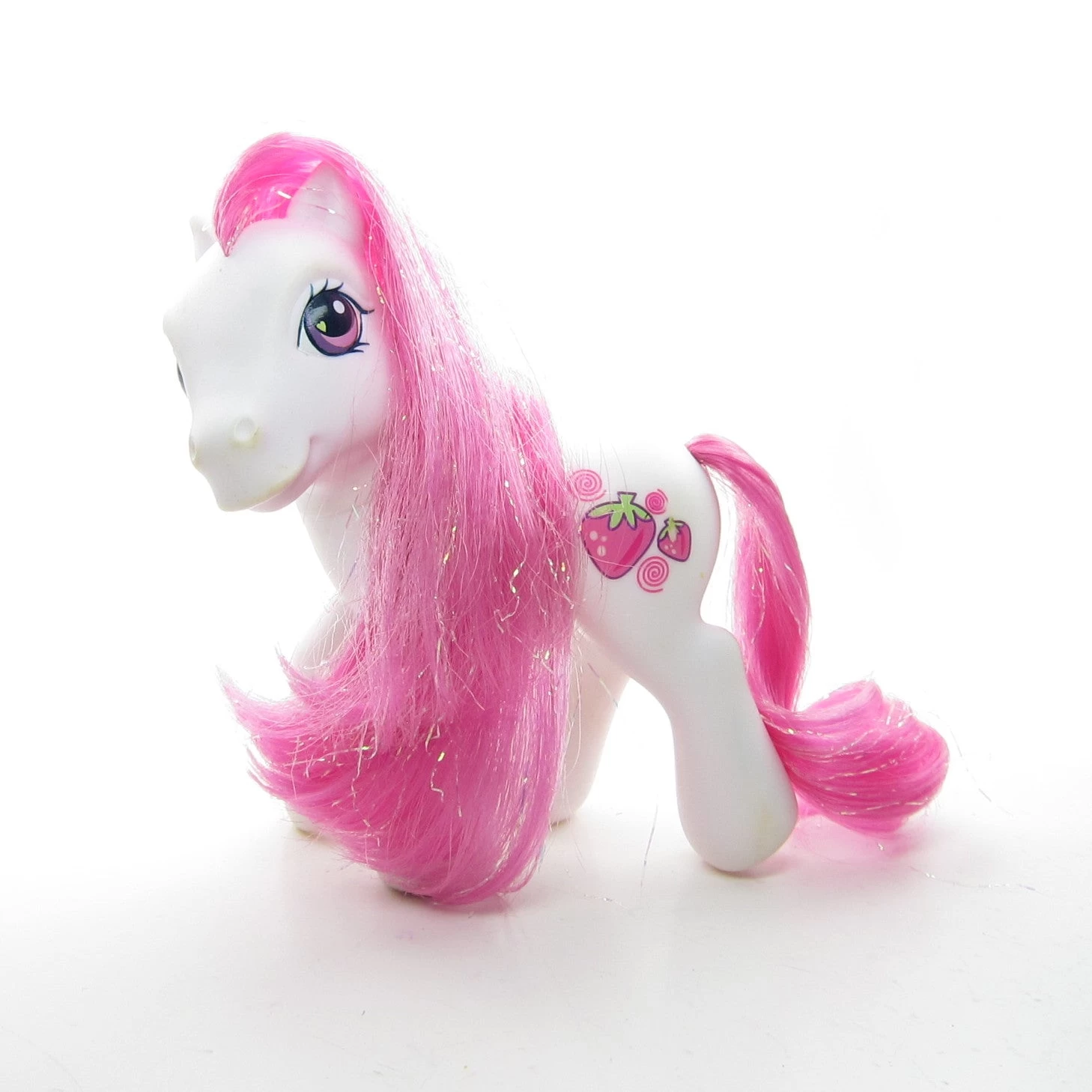 This My Little Pony is Strawberry Swirl, she’s from the Let’s Go Purse Set released in Year 3 of the G3 line. Strawberry Swirl has a white body and pink hair with iridescent tinsel. Her eyes are pink and purple with a light green heart and her cutie mark is two strawberries and three swirls. She has a pink hoof heart on her front left hoof and a magnet on the bottom of that hoof.