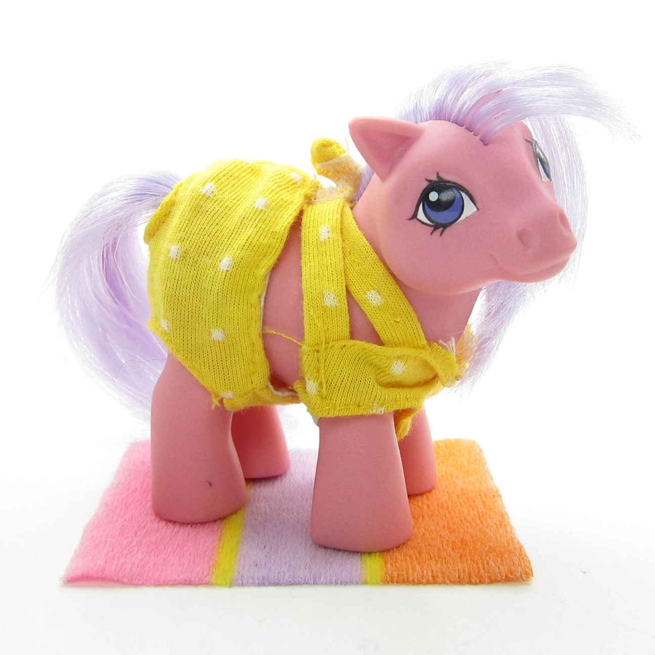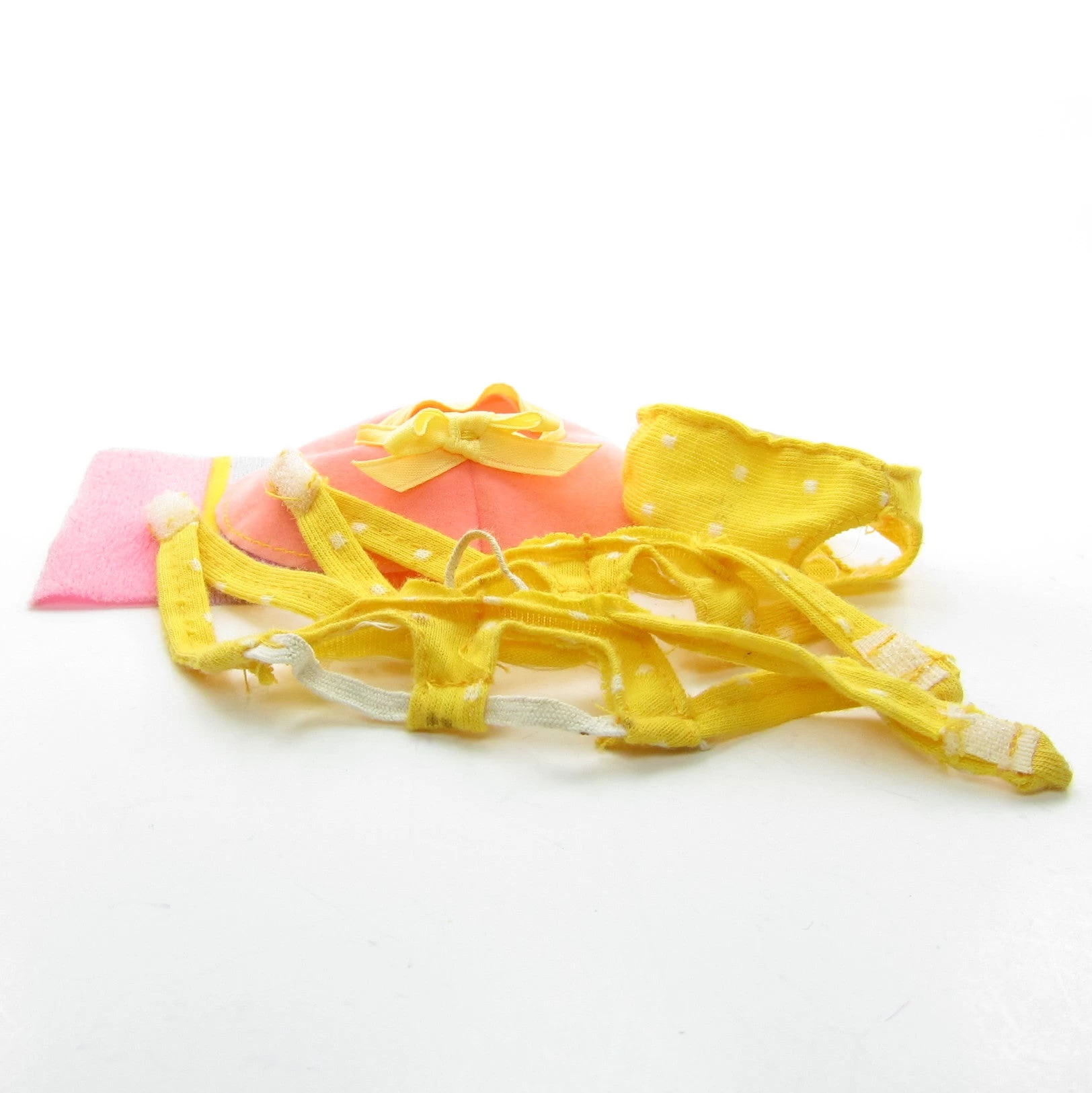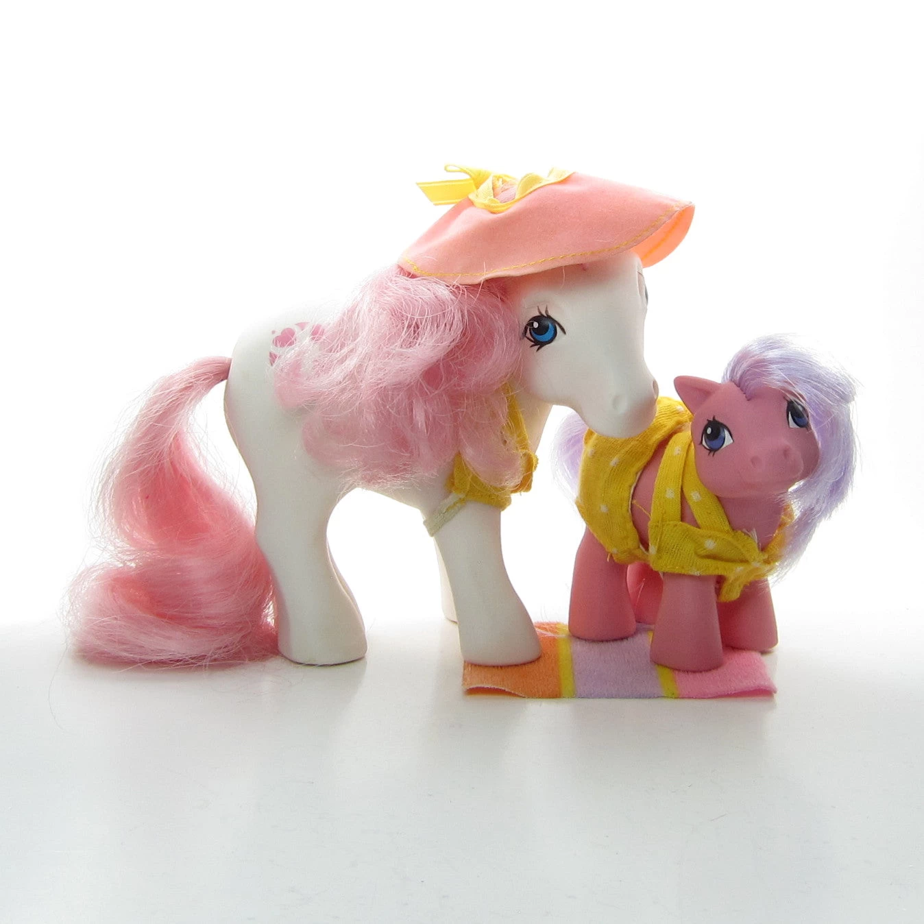 These vintage G1 My Little Pony outfit pieces are from the Sun and Fun Pony Wear set from the Mother and Baby Pony Wear line. The outfits include a yellow baby pony bikini (top and bottom), one beach blanket, a yellow bikini top for an adult pony, and an adult pony sun hat. The set is incomplete.