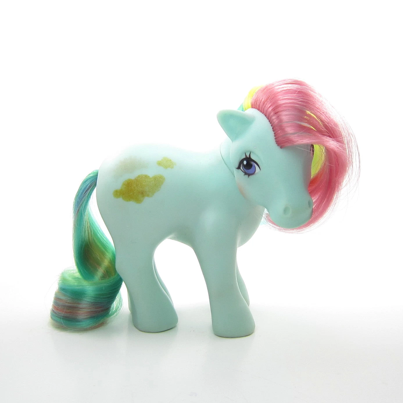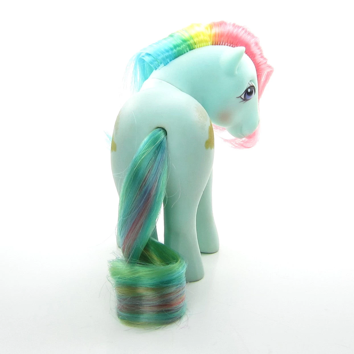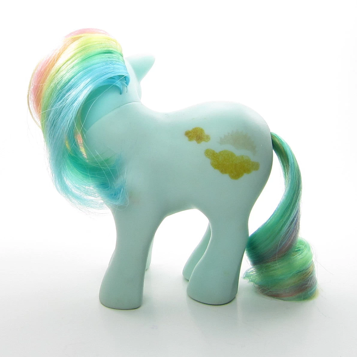 This vintage G1 My Little Pony is Sunlight, she’s an aqua Rainbow Pony that first appeared in Year 2 of the My Little Pony line. Sunlight’s mane and tail both have shades of pink, yellow, green and blue, and her eyes are purple. Her symbol was a glittery silver sun with gold clouds, but the glitter has worn off and all that remains of the design is the glue.