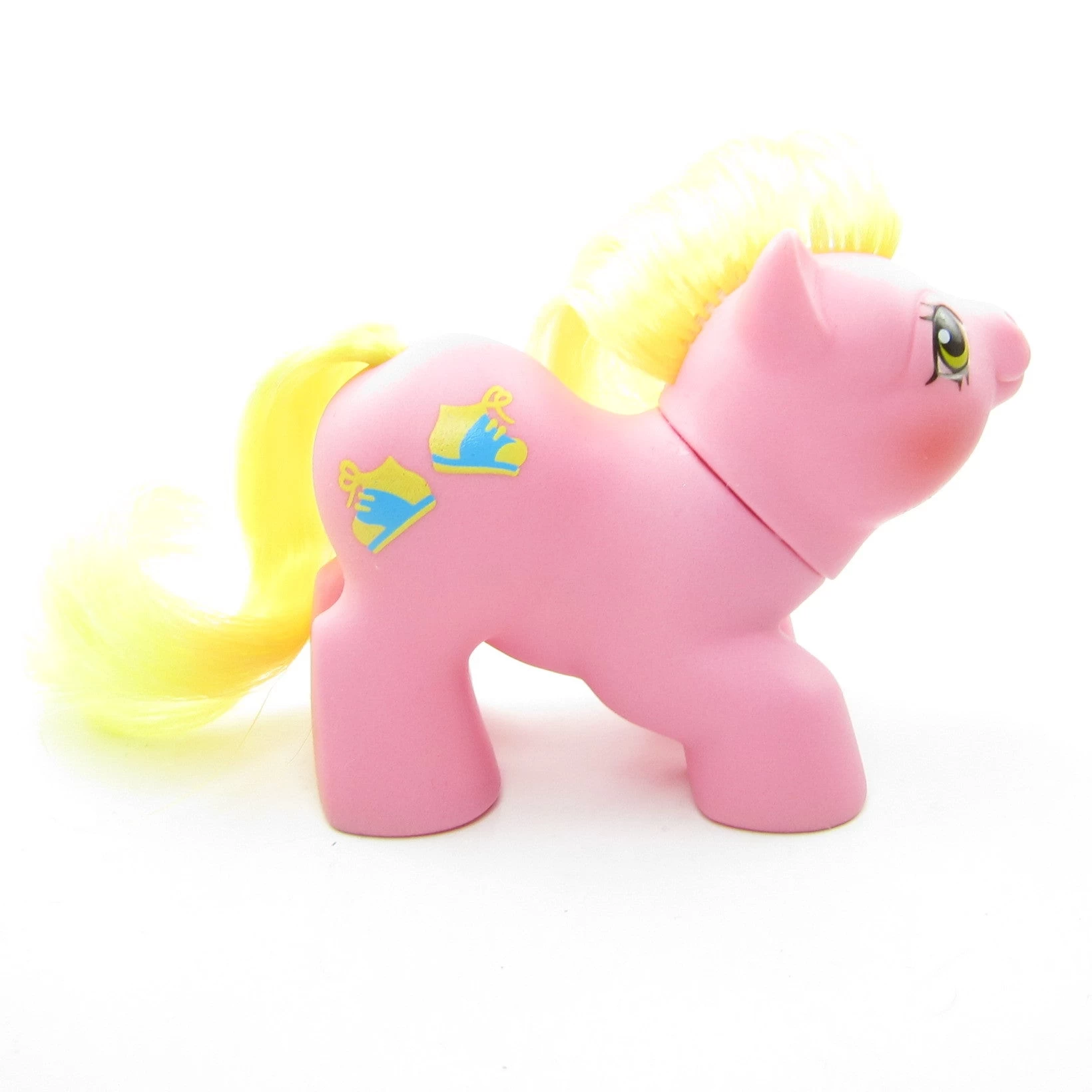 Tappy is pink with yellow eyes and yellow hair and has a pair of pink and blue sneakers for her symbol. As one of the Newborn Ponies, she’s smaller than the other baby ponies.Â