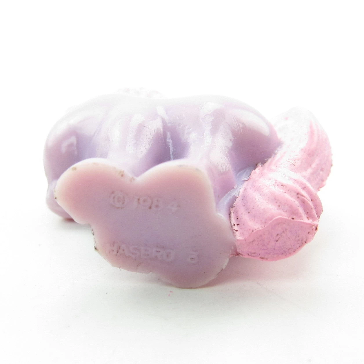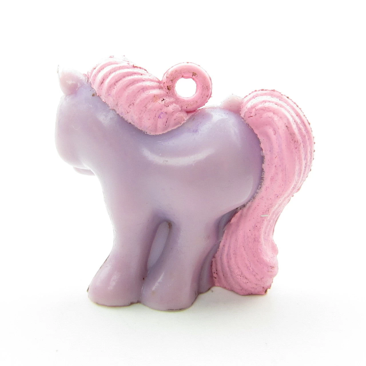 This vintage G1 My Little Pony mommy or mummy charm is Tell-A-Tale. She’s purple with pink hair and a white book for her symbol.