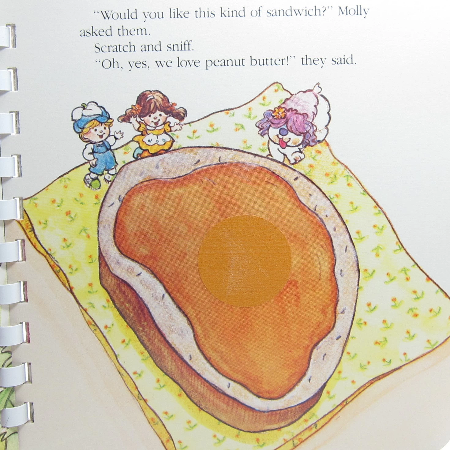 Each of the six scented pages has a scratch and sniff sticker on it. The scents include rye bread, honeysuckle, peanut butter, watermelon, orange juice, and cinnamon candy hearts.