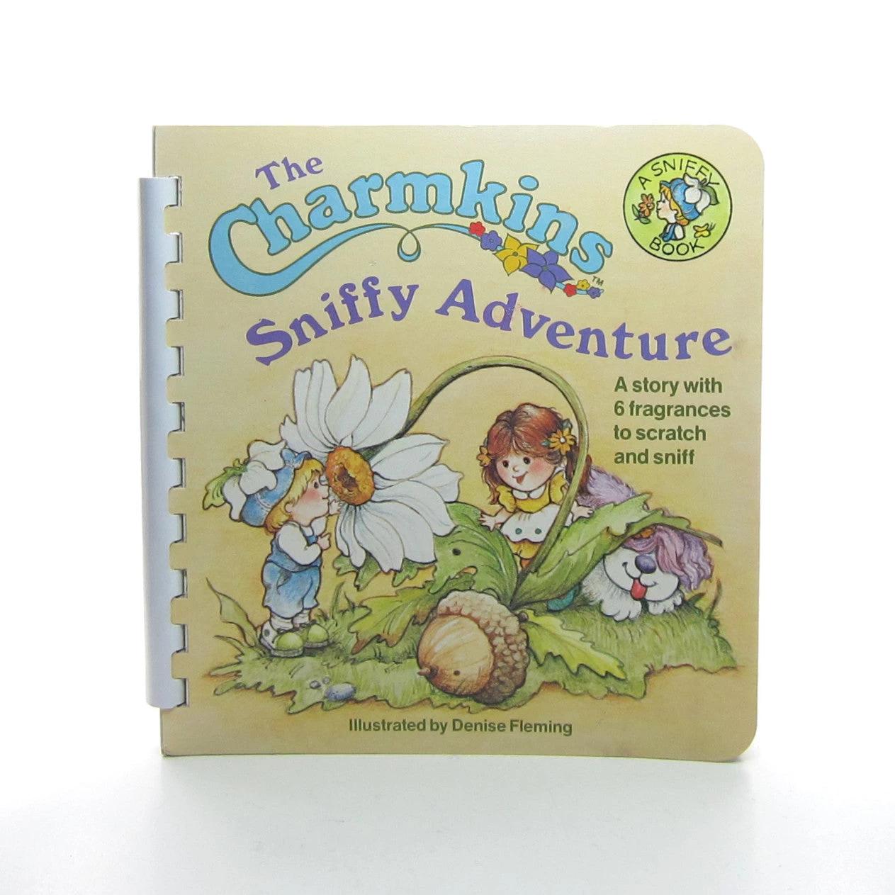 This rare vintage Charmkins book is called “The Charmkins Sniffy Adventure” and has six scented scratch and sniff pages. The story features Charmkins characters Brown Eyed Susan, Willie Winkle, and Buttercup the dog.