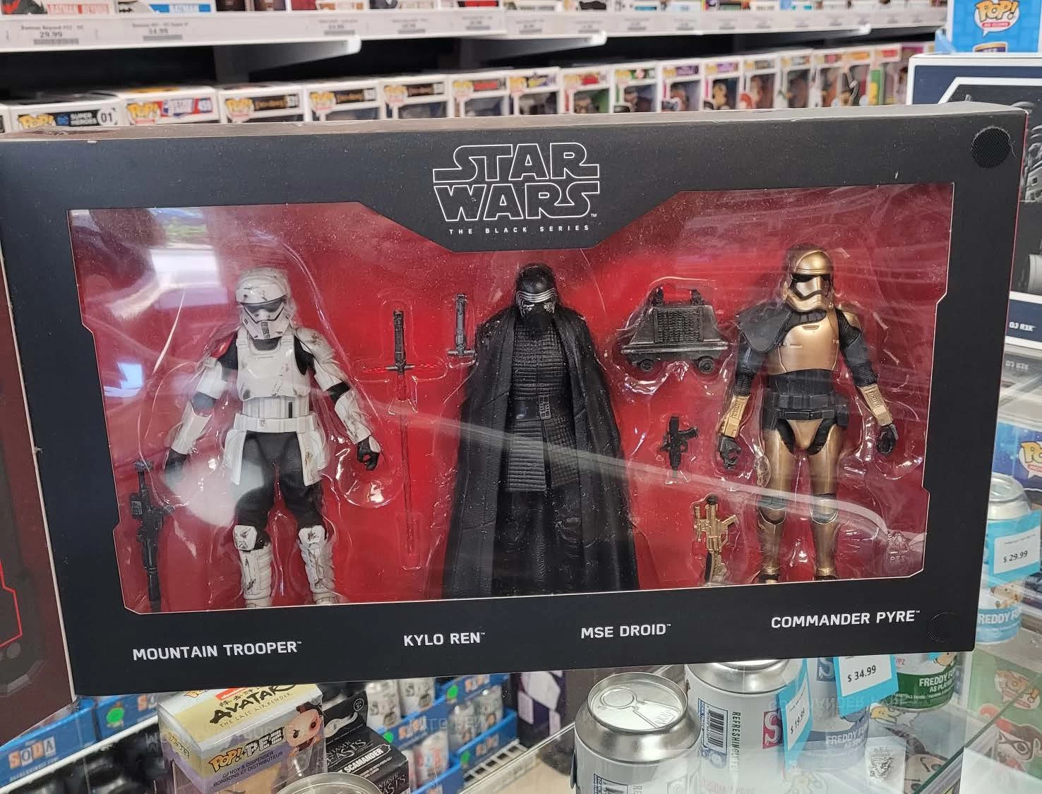 โ Collector set includes Kylo Ren in his TLJ outfit, gold plated Stormtrooper Commander Pyre, (MSE) Droid and a Mountain Trooper action figures.