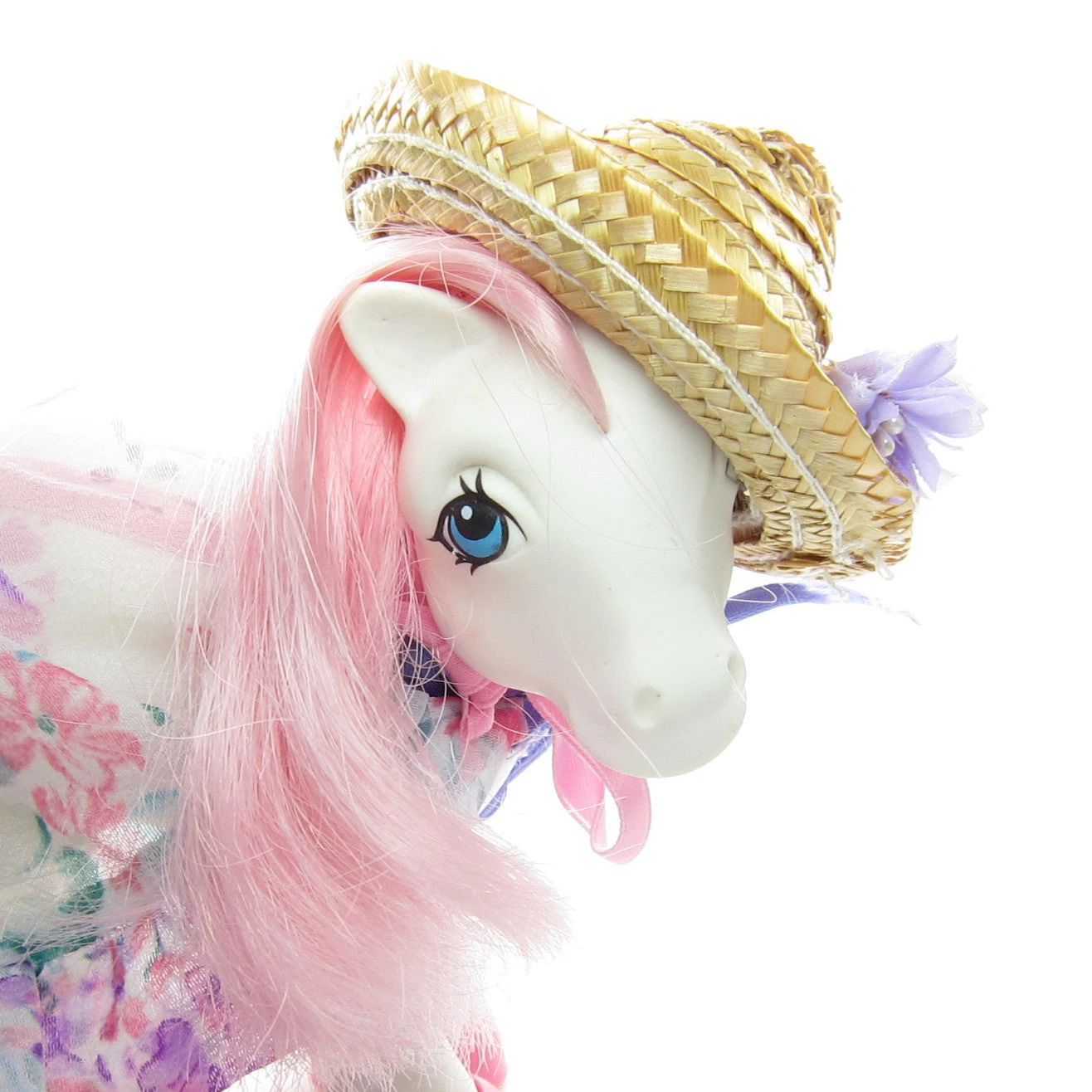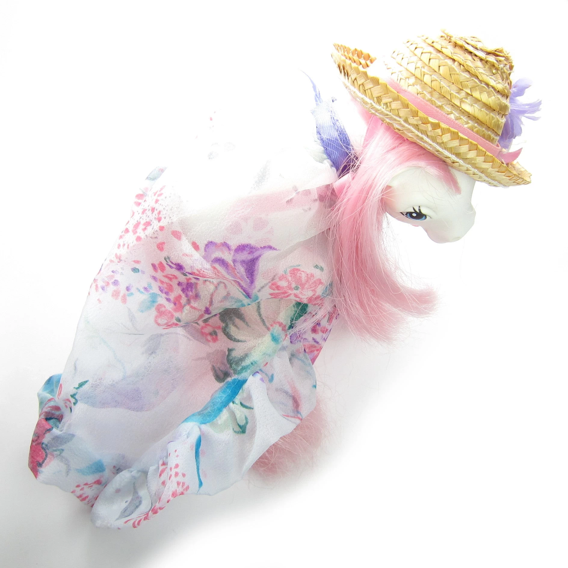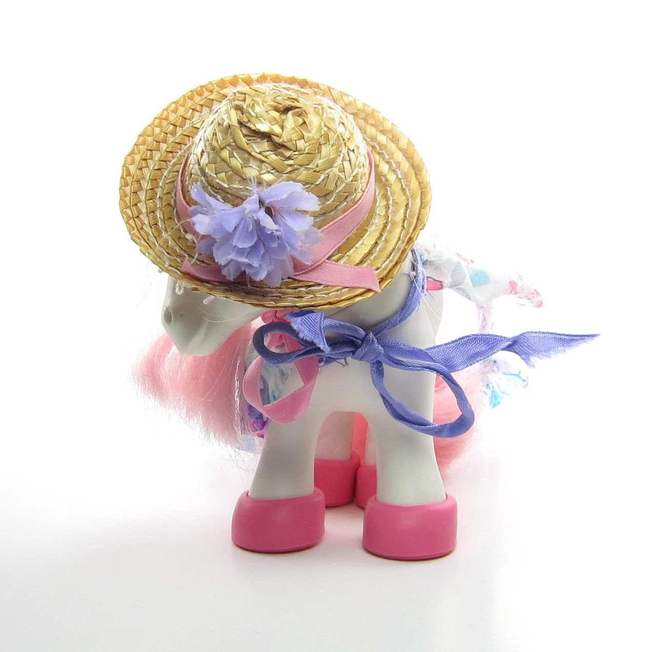 The straw hat has a pink bow that ties under the pony’s chin, and the party shawl has a purple ribbon that ties around the neck.