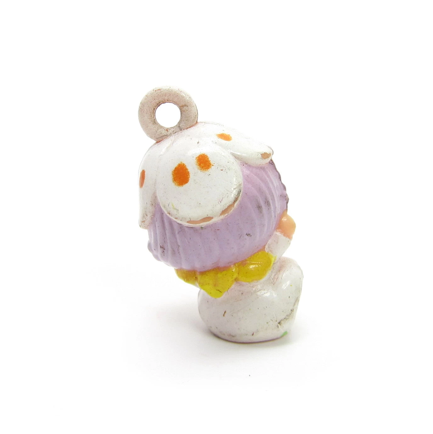 This vintage Charmkins charm is Twinkle. She’s a cute little girl with purple hair and hangs from a barrette or hair clip with a yellow rose and green leaves. She originally came with Snowflower Swan, but the swan is missing.