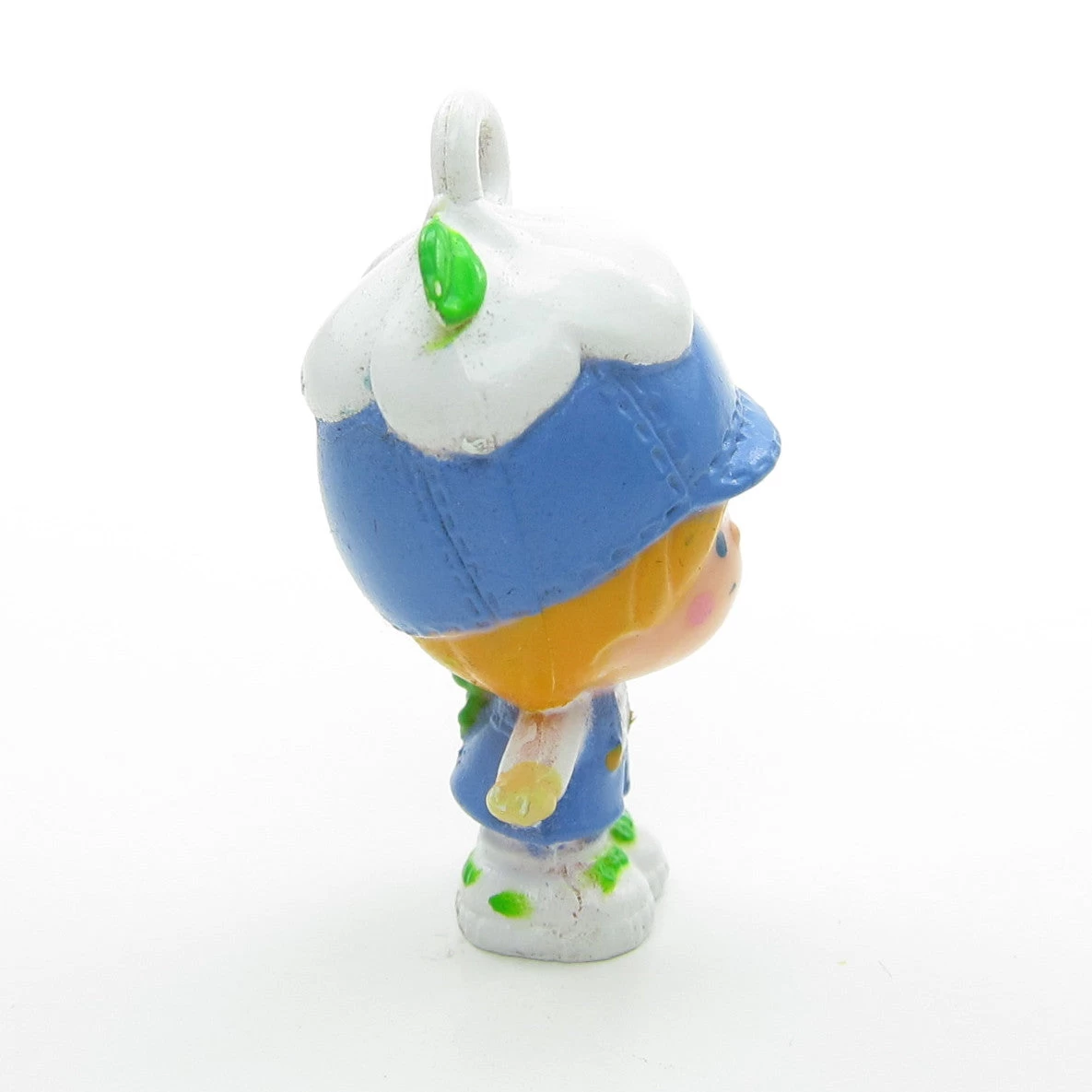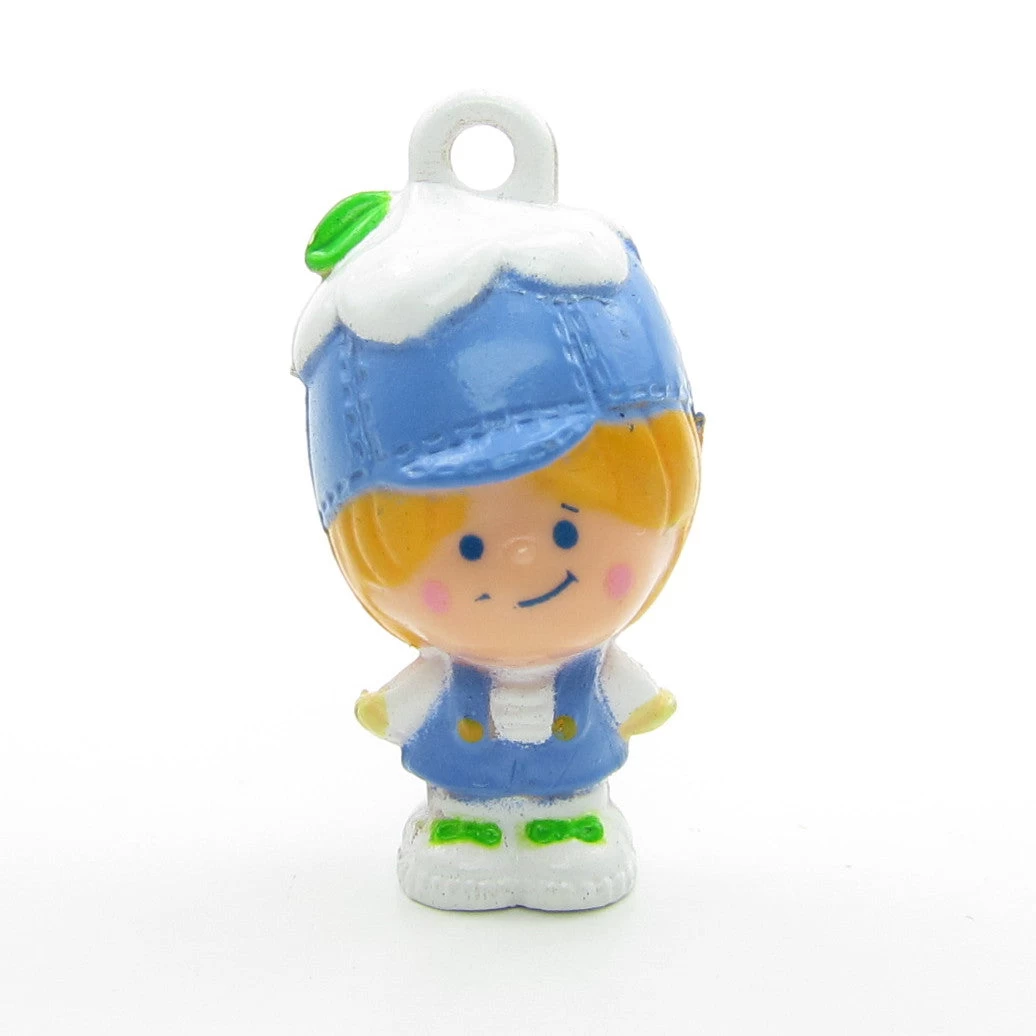 This vintage Charmkins boy is Willie Winkle, he comes with a blue button hanger. Willie Winkle has strawberry blonde hair and wears a blue outfit with a matching blue hat that has a white flower on top. Some variations of this Charmkin came with a white and dark blue button hanger, this particular one is light blue with dark blue trim.