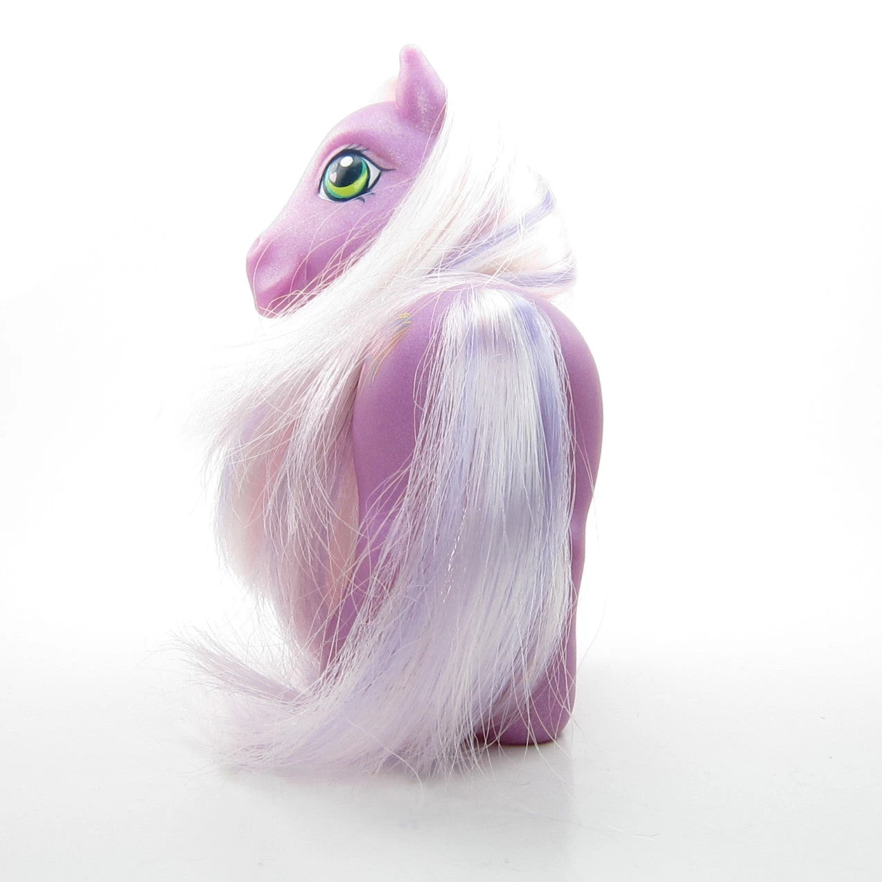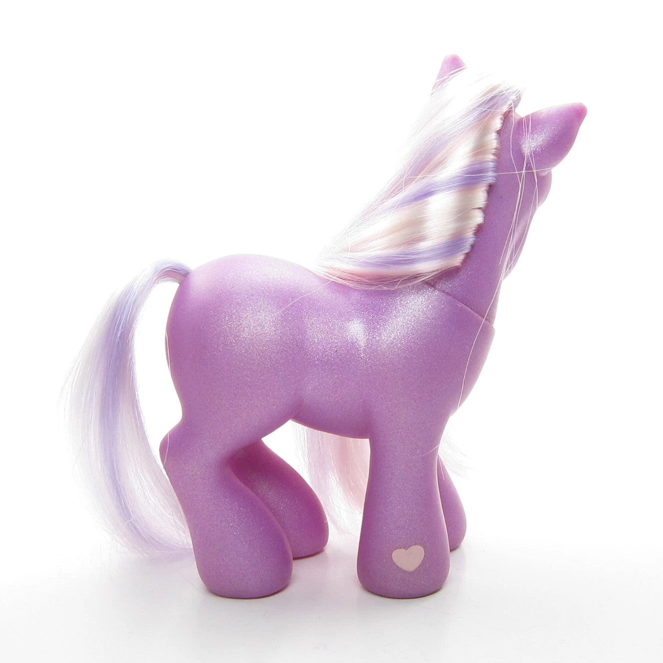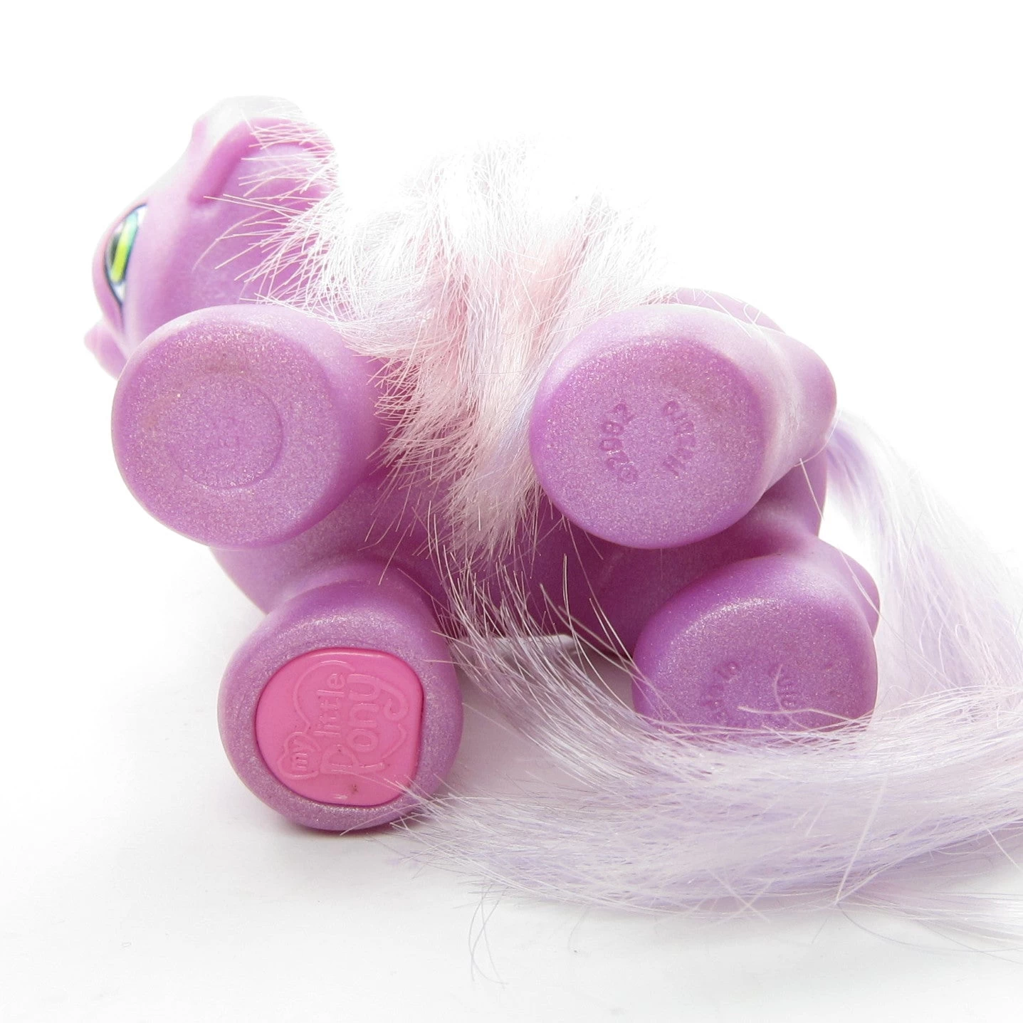 This My Little Pony is Wysteria I, she’s one of the Rainbow Celebration Ponies from Year 1 of the G3 line. She has a pearlescent purple body and green eyes with a pink heart. Her hair is white, pale pink, and light purple. Her symbol is a cluster of flowers. She has a pink hoof heart on her front right leg and a magnet on the bottom of that hoof.