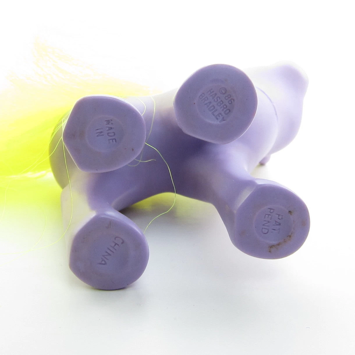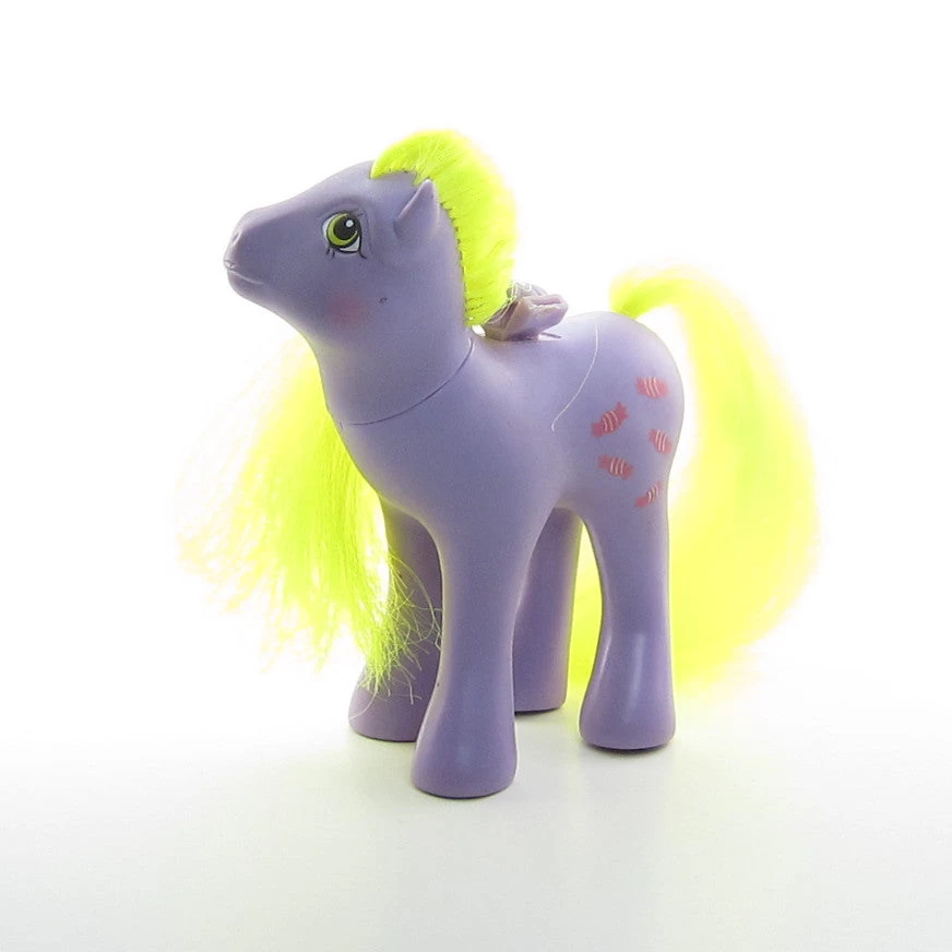 This vintage G1 My Little Pony is Yum Yum, she’s a Flutter Pony from Year 4. She was originally included as one of the five ponies in the Party Gift Pack pony set and was never sold separately.Â