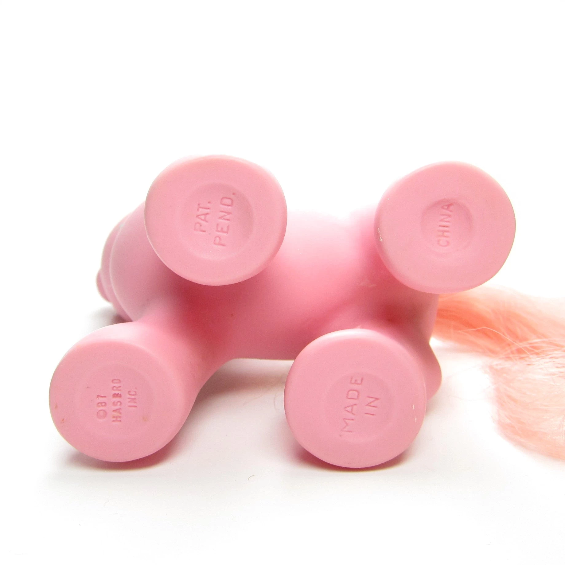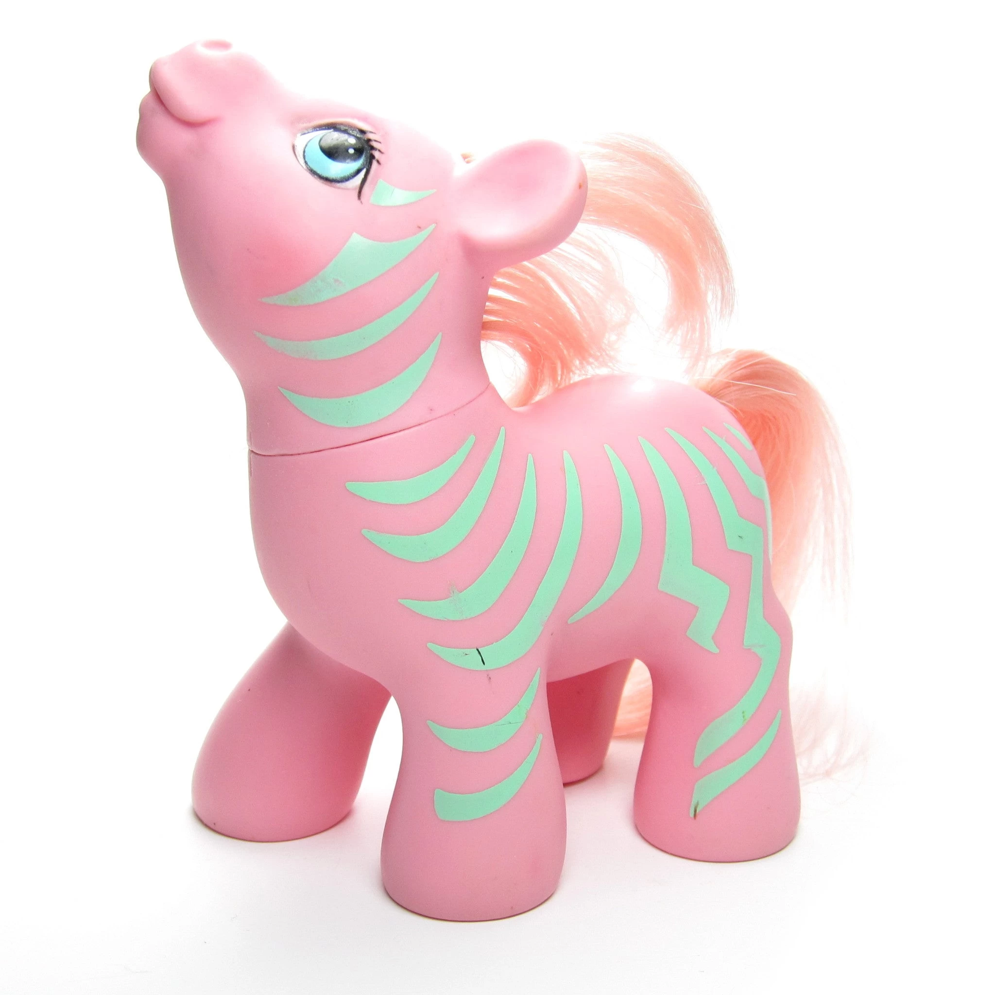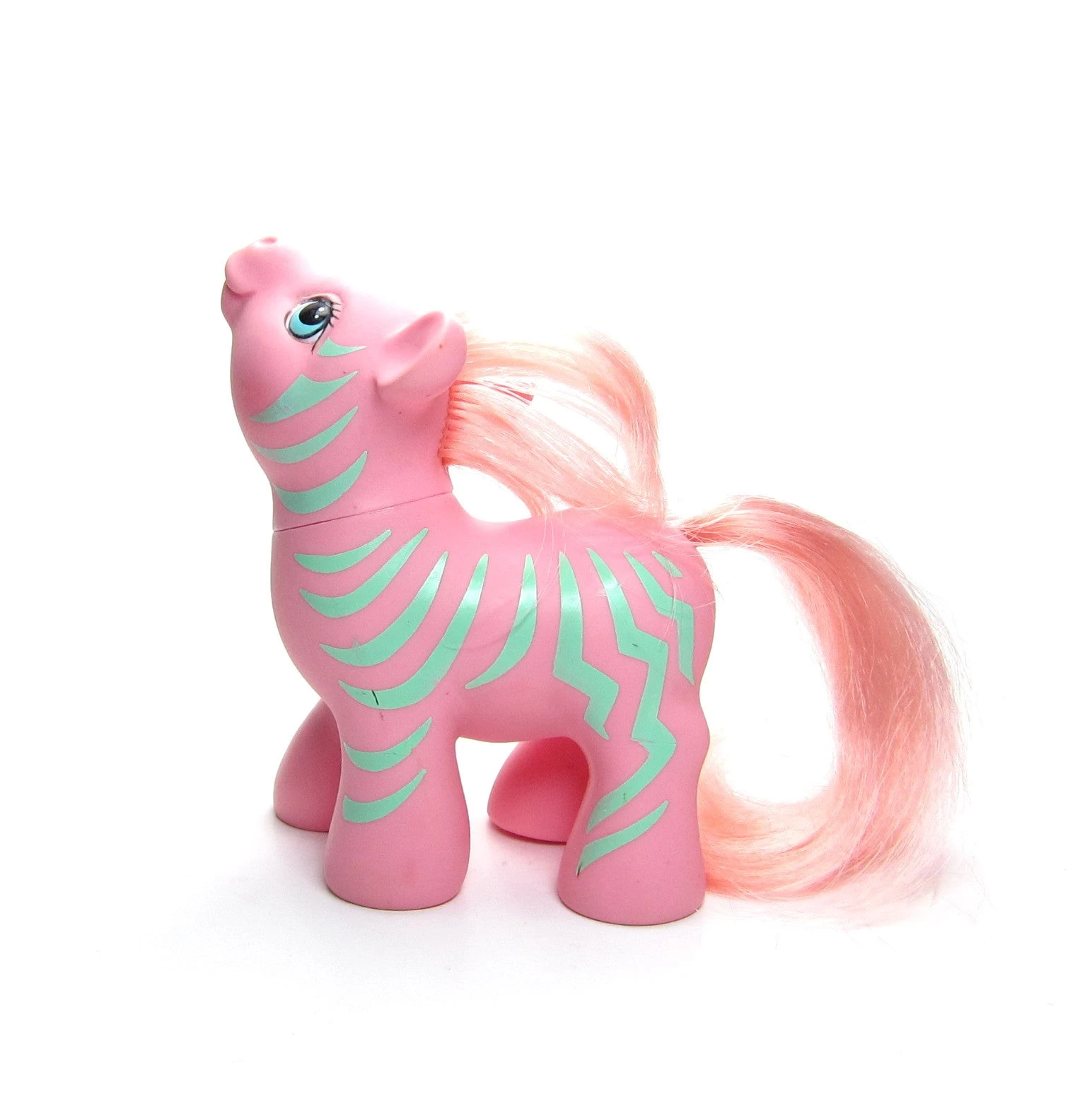 This vintage My Little Pony toy is Zig Zag the Zebra, she’s one of the Pony Friends from Year 5. She’s pink with green zebra stripes on her sides and face. She has aqua blue eyes and a pink mane and tail.
